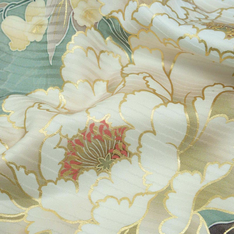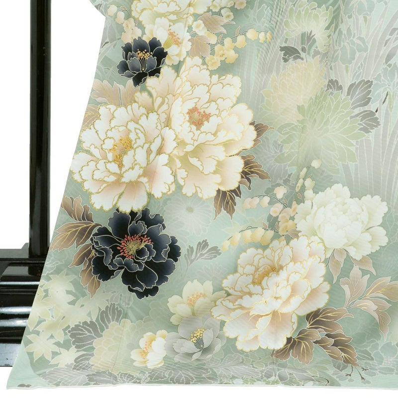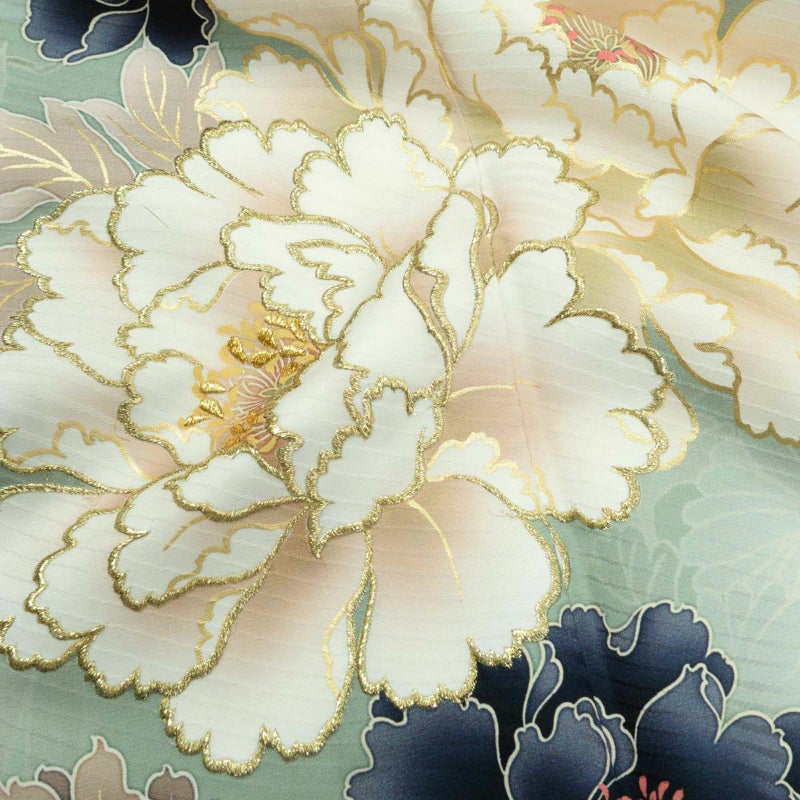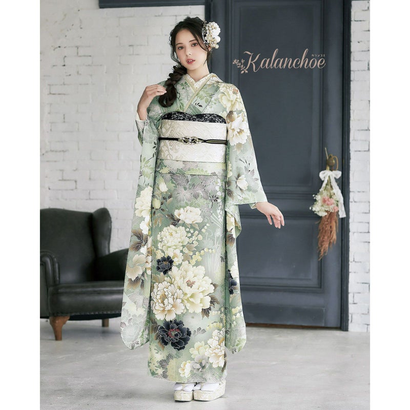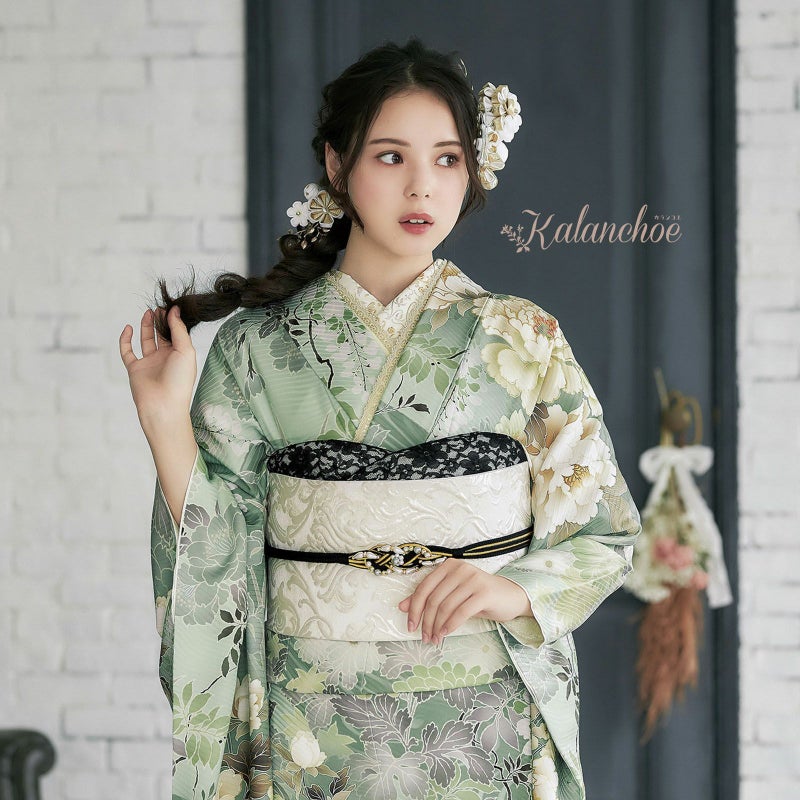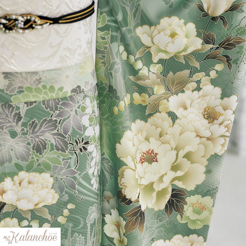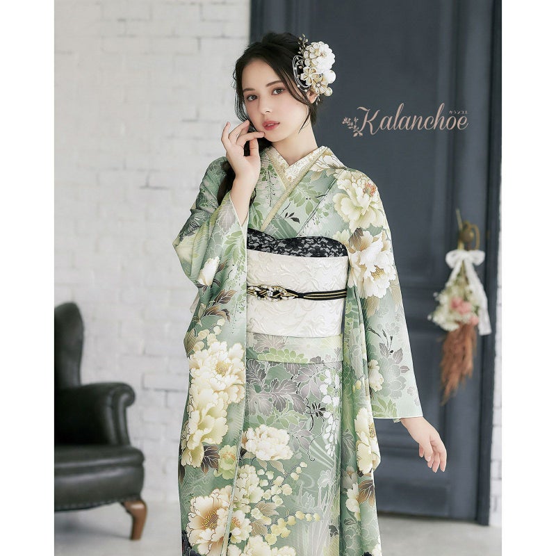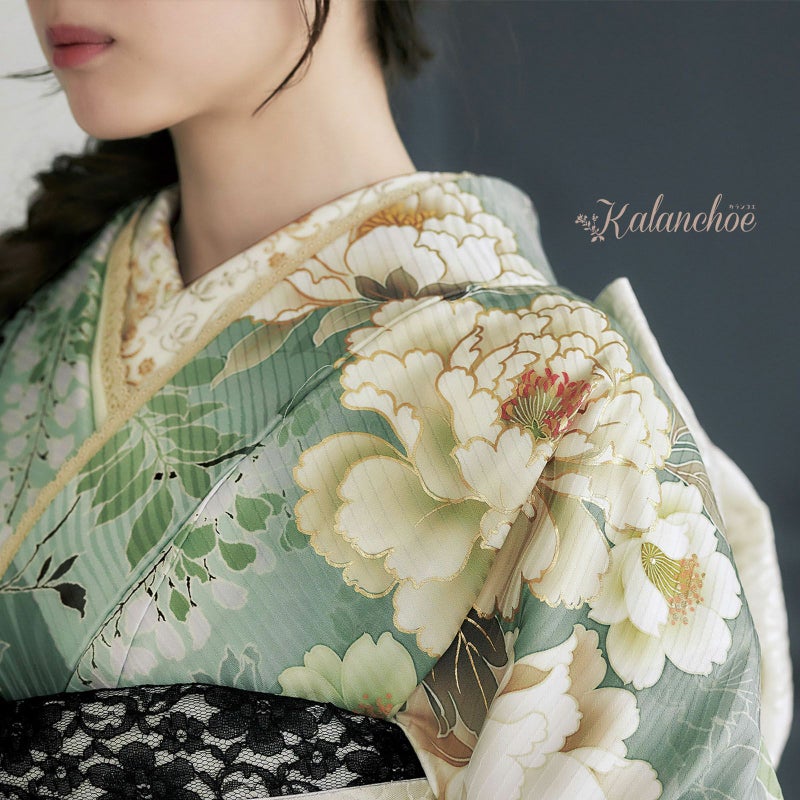 ブランド名「カランコエ」は由来として「幸運を告げる」また、星の形をした花を長く咲かせることから「長く続く愛」という花言葉もつけられています。お着物自体の柄には牡丹の花・地色はトレンドのモスグリーンを施した京友禅 花言葉に込められた幸福をご自身にも周りにも告げるような素敵な作品に仕上がりました。