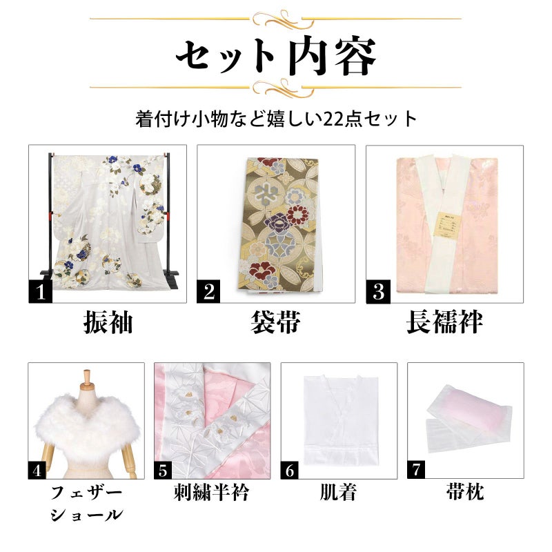 【商品内容】振袖(仮絵羽・未仕立て)、袋帯(未仕立て)、長襦袢(未仕立て)、ショール、刺繍半衿、肌着、帯枕、帯前板、帯後板、衿芯、伊達締め2本、コーリンベルト、三重仮紐、腰紐6本、足袋、着物ハンガー、振袖お仕立て、帯お仕立て、襦袢お仕立て、半衿縫い付け、胴裏正絹、長襦袢正絹の計22点セット