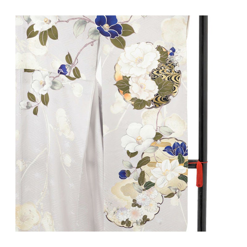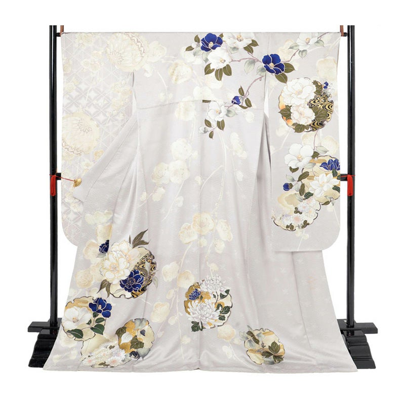 とびっきりのガーリーさに大人を併せ持つブランド”Minette reve” 薄目のグレー地に花を雪輪柄に大胆に表し、青の梅がさらに上品さを引き立てます。京友禅を今様に施した振袖です。