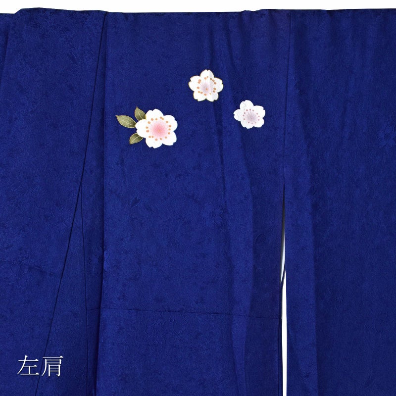【色柄】桜の地模様のあるあざやかな紫みの深い青の地、裾や袖にピンクの疋田や金彩の入った市松模様。白にピンクぼかしの桜の花に金茶色や赤、手鞠が散らされています。八掛はあざやかな黄色。