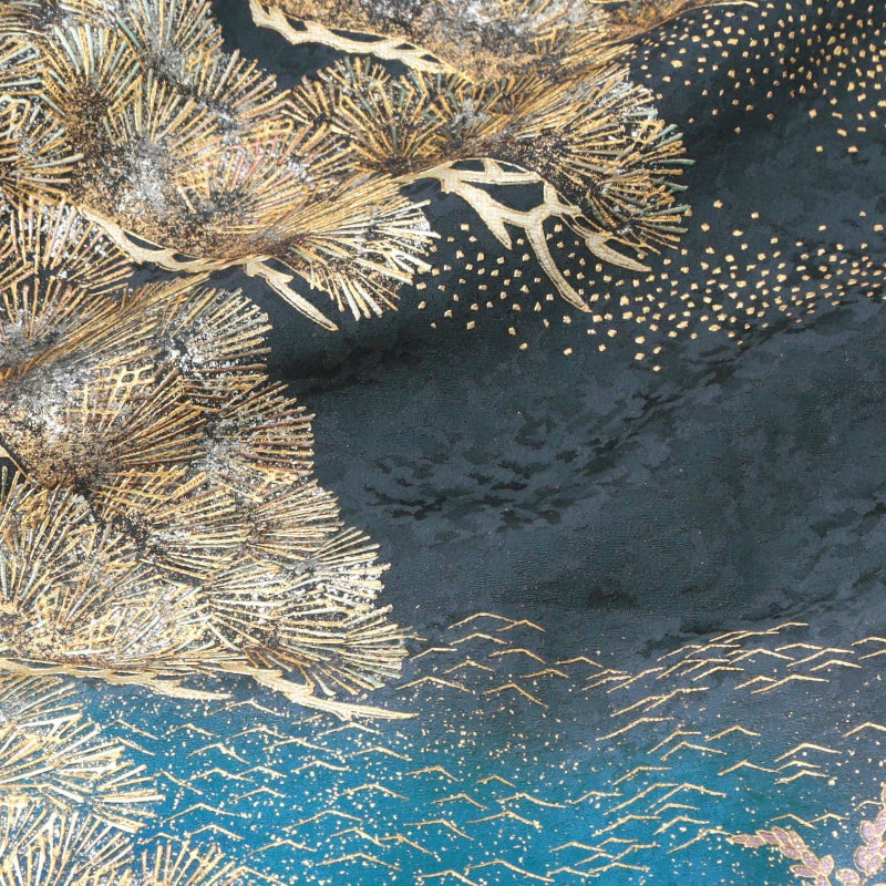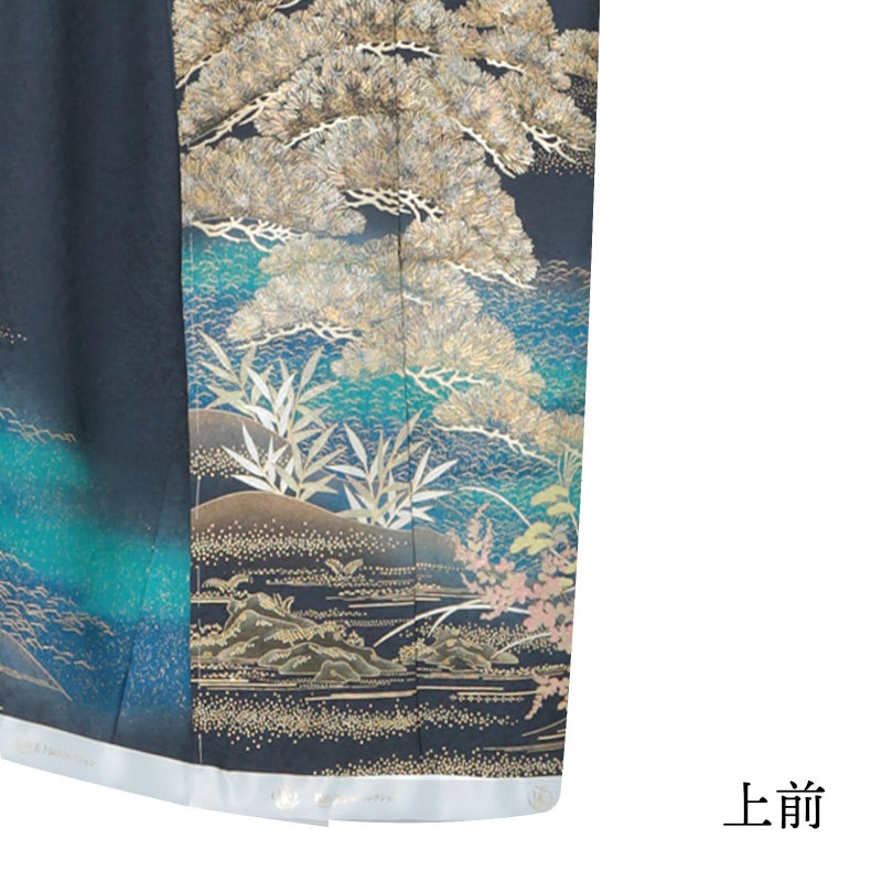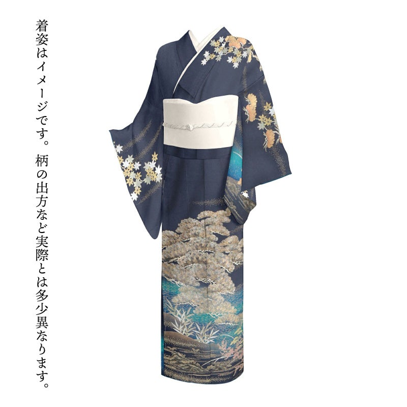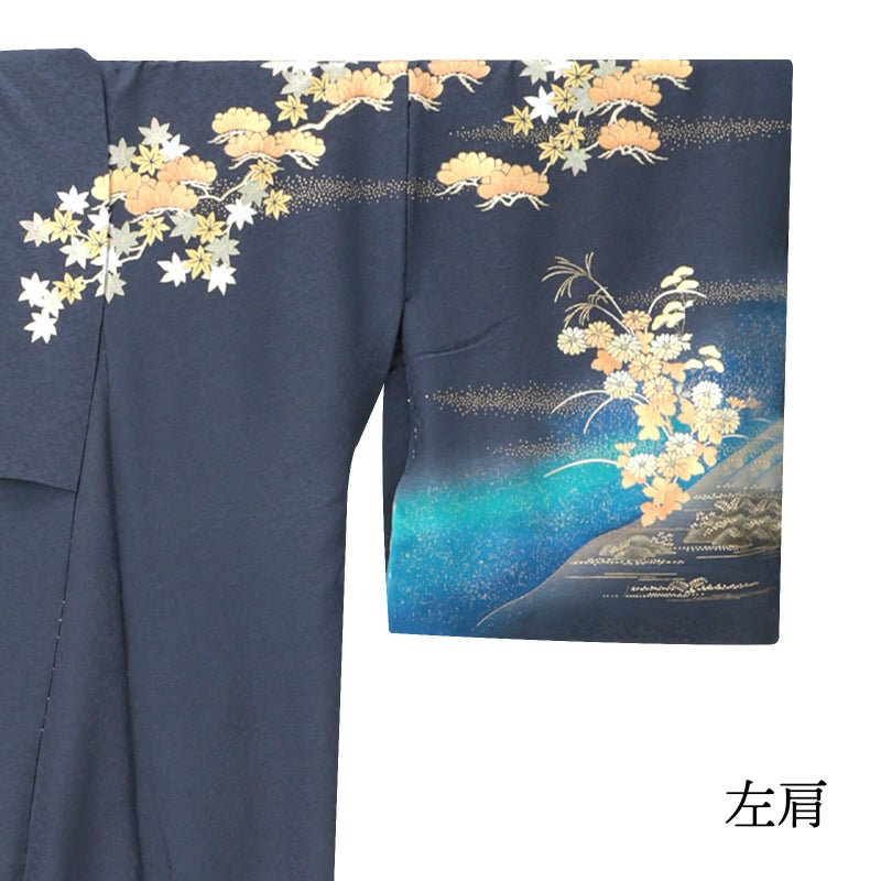 やや灰みの深い青紫系の地に、浅葱色、瑠璃色の裾ぼかし。裾には金彩、銀彩で表現された針松に岩波、葦など水辺の文様。さらに菊や萩、桔梗などが華やかさを添えています。赤銅色を帯びた松に錫色の楓。細かな地模様のある地に金、銀の立体感や色みの変化が、絢爛豪華かつ奥行きを感じさせる訪問着です。
