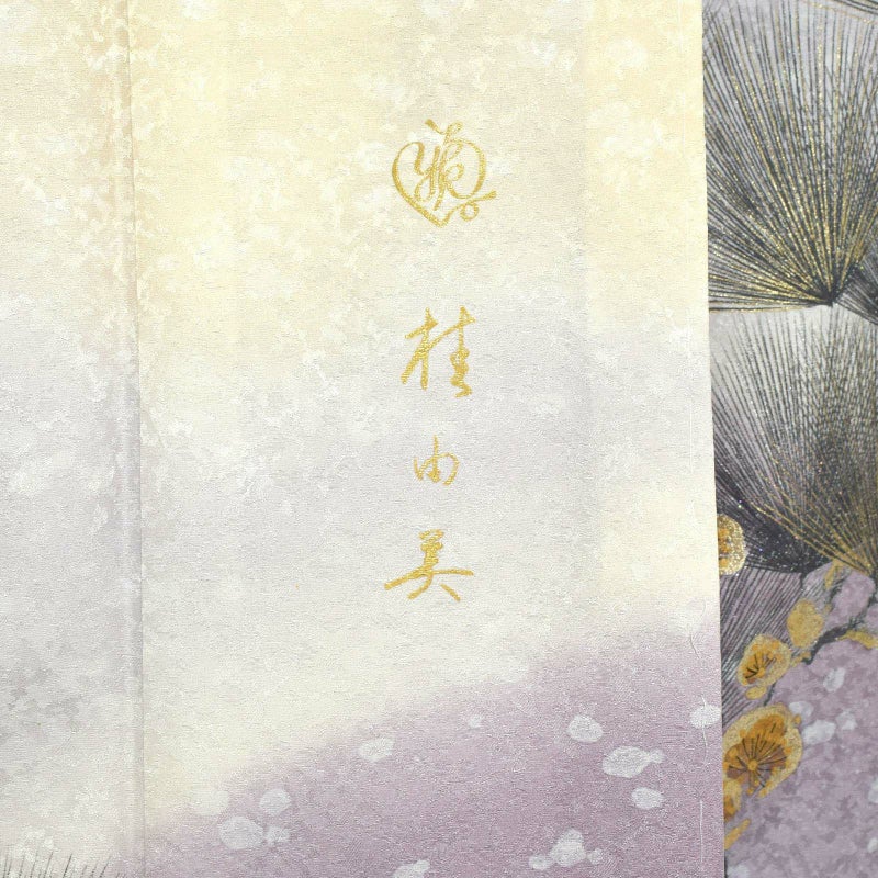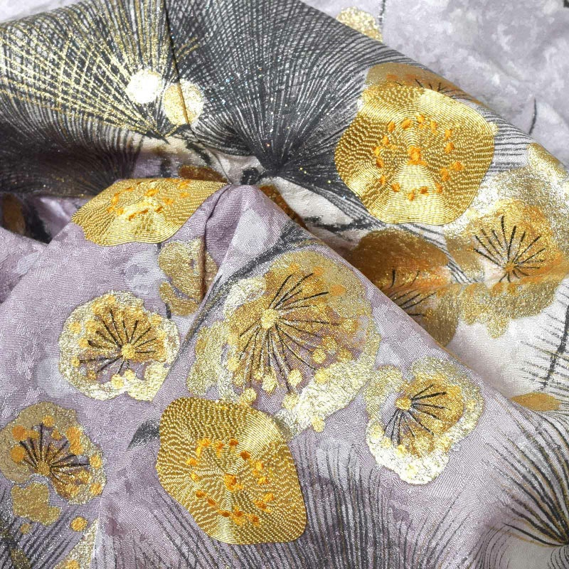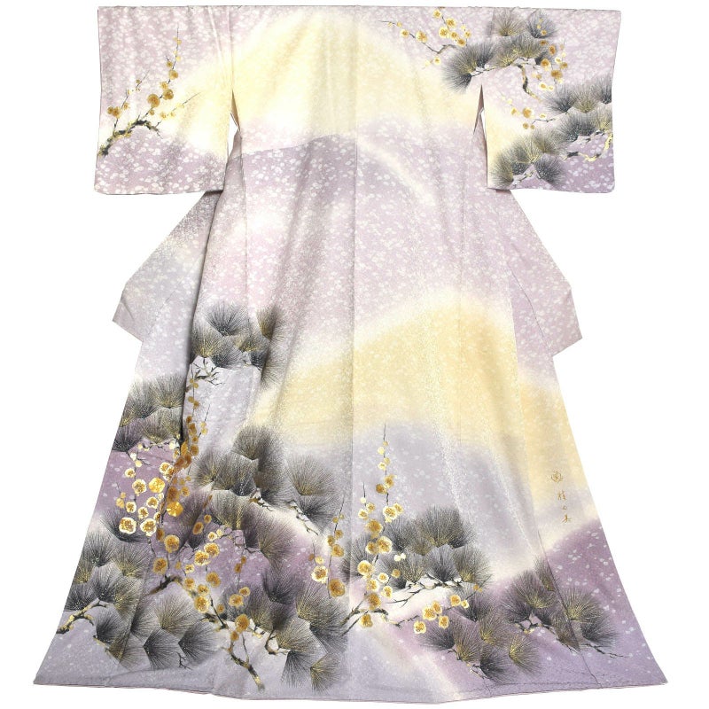 細かな地模様のある藤色の地に、吹雪のような白の模様。淡い黄色、薄紫色のぼかし。薄墨色で描かれた針松は枝に金が刷かれ、松葉に金彩、銀彩、ラメが施されています。薄墨色に金銀で描かれた梅の花。優雅でありながら存在感のある煌びやかな訪問着です。八掛は白藤色。