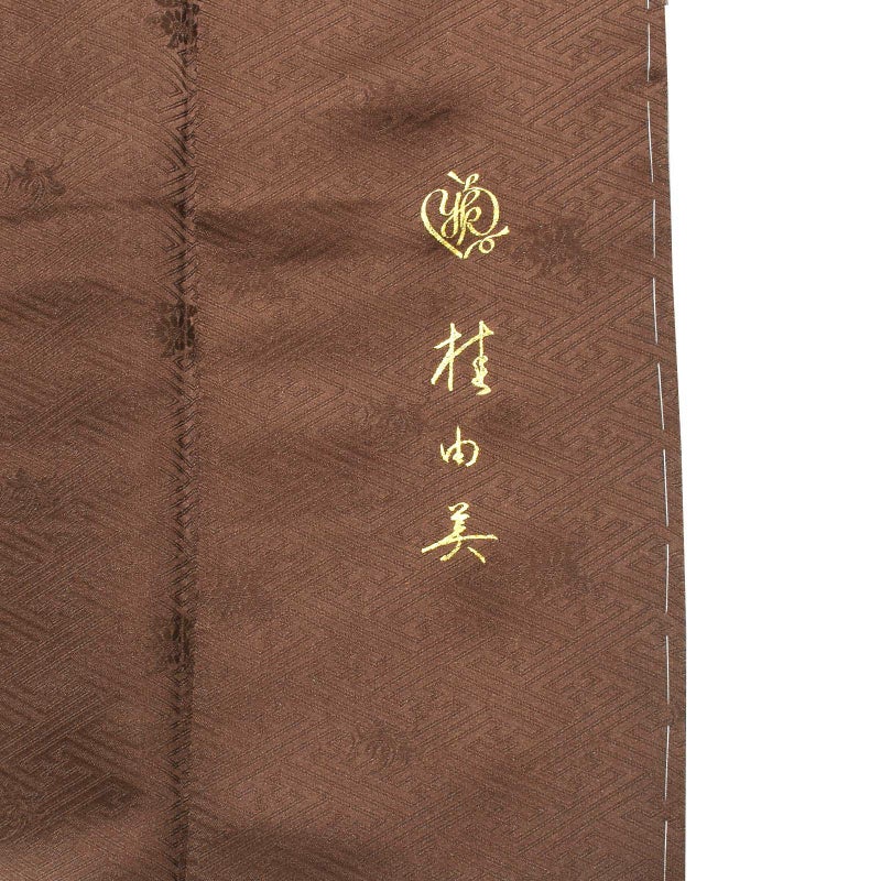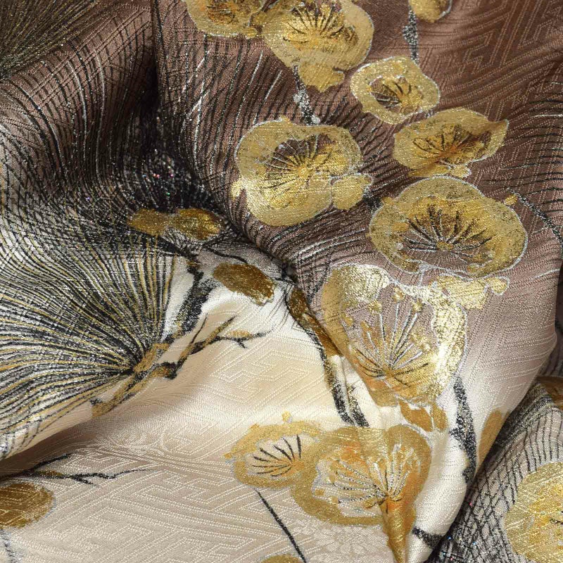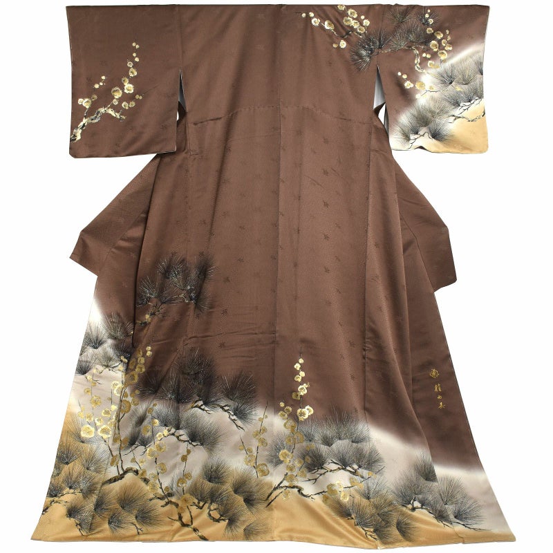 紗綾形の地模様のこげ茶色の地に、白茶色、浅い黄土色の裾ぼかし。黒で描かれた針松は枝に金が刷かれ、松葉に金彩、銀彩、ラメが施されています。黒に金銀で描かれた梅の花。シックでありながら重厚かつ煌びやかな訪問着です。八掛は亜麻色。