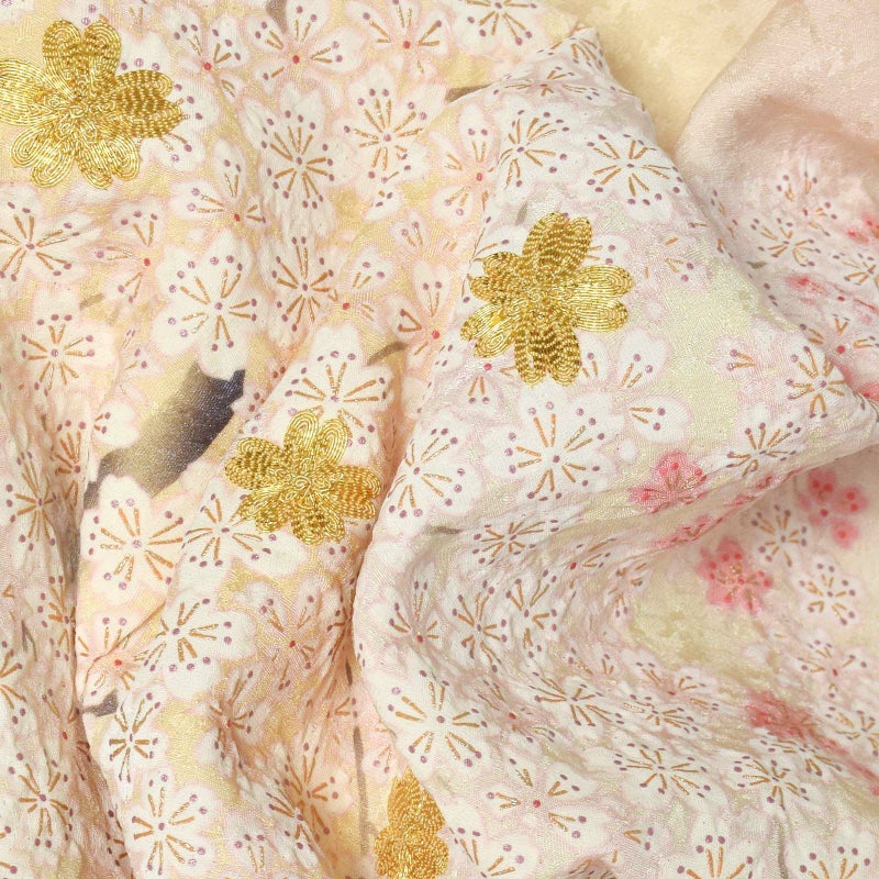 細かな地模様のある生地。ややグレイッシュなやわらかい黄色の地に淡い黄色、香色のぼかし。肩から背にかけて淡いピンクの輪郭線に白の桜の花、濃いピンクの挿し色、薄緑の葉の枝垂れ桜が咲きこぼれ、裾には満開の桜木、ゴールドの輝きのある顔彩の流水に流れる花びら。金駒繍の桜の花。しっとりと繊細な華やかさがあります。八掛は淡いベージュ地に桜の柄八掛、褄下の表地と八掛の間にラメ感のある薄黄色の合い布。