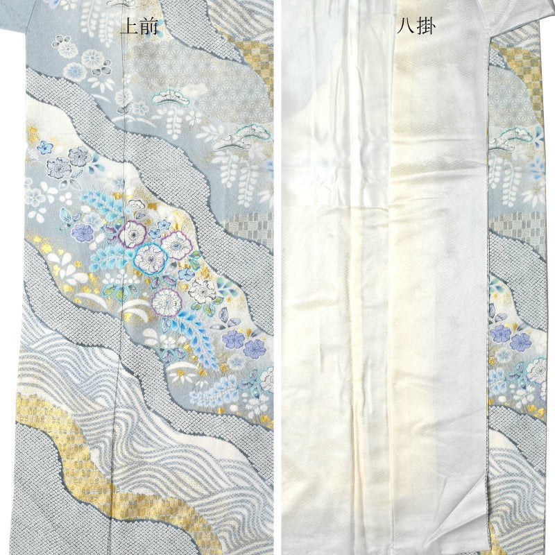 銀通しのオフホワイトの地に、ブルーグレーや藍鼠色の道長取り。淡い青紫、水色などの辻が花に、波文や疋田、七宝、市松文様。ポイントの金彩が上品な煌びやかさを添えます。