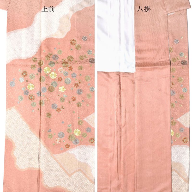 細かな地模様のある生地。やや灰みのやわらかいコーラルオレンジの地に、生成色や香色の山と霞取り。その中に疋田や金の流水や吹き寄せなどの小紋。上前や袖を中心に、立体的な金彩、銀彩、金駒繍の菊紋や梅文が散らされています。