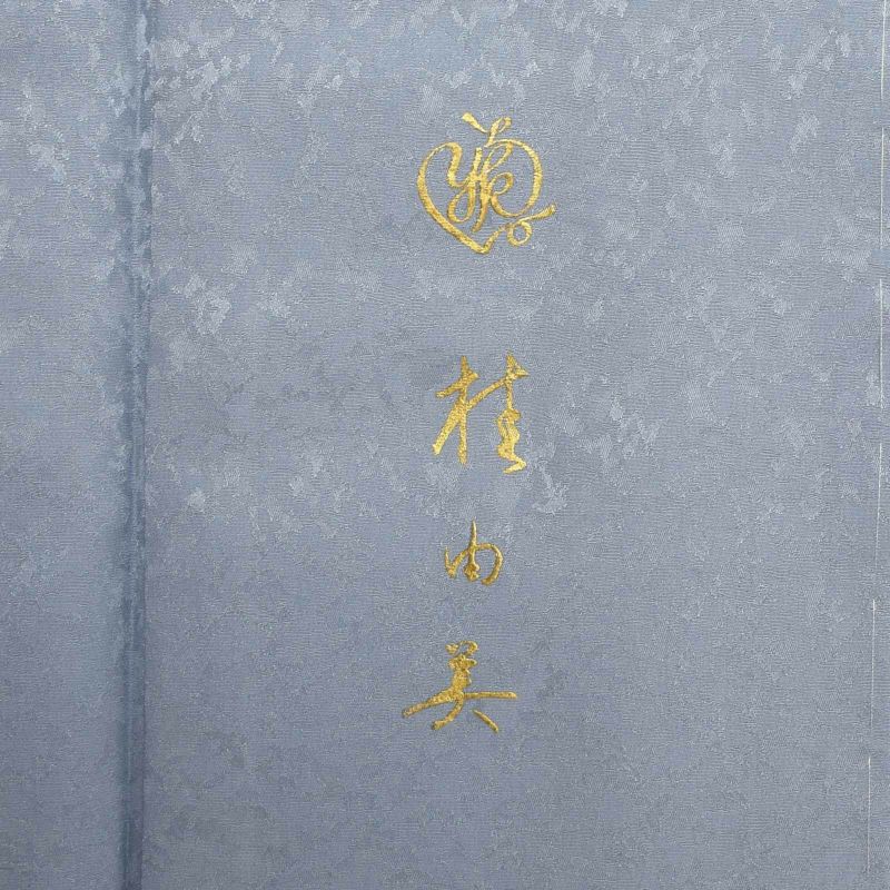 細かな地模様のある生地。墨色の地に右袖から背にかけて弧を描くように青みのグレーで染め分けられた地。グレーの滝に沿ってグレーや牡丹鼠色の桜。裾には流れるような配置で紫、ピンク、青藤色、浅い赤紫色の桜の花々が密に表現されており、まるで花筏のよう。ポイントの金彩が控えめな煌びやかさを添えています。