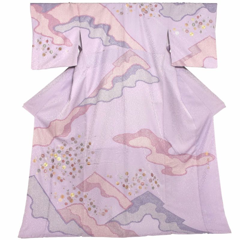 細かな地模様のある生地。グレイッシュな淡い赤紫系の地に、藤鼠色や淡い浅紫の山と霞取り。その中に疋田や銀の流水や吹き寄せなどの小紋。上前や袖を中心に、立体的な金彩、銀彩、金駒繍の菊紋や梅文が散らされています。