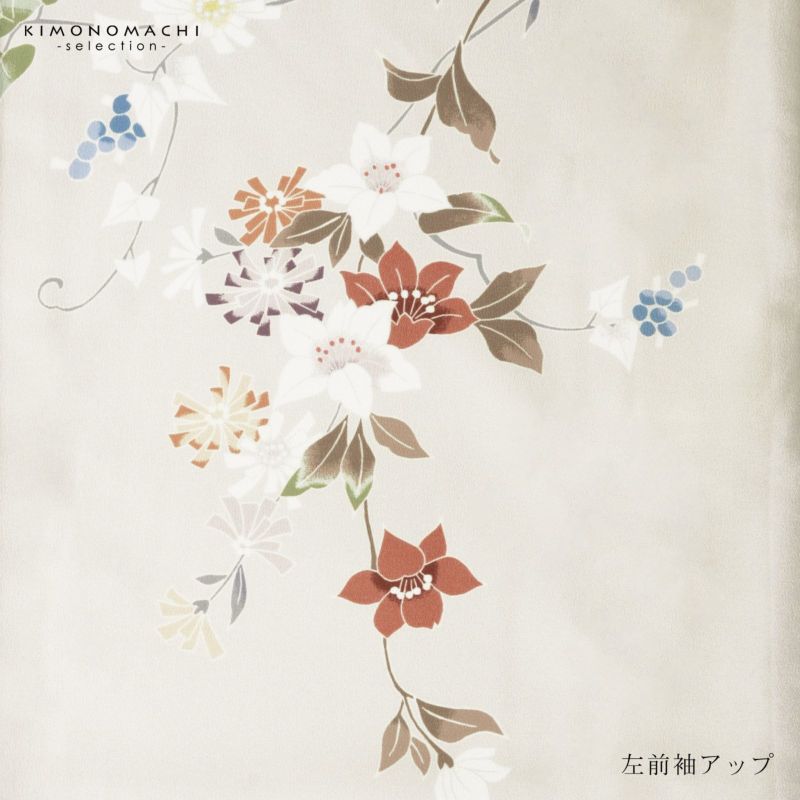【色柄】やや黄みの淡いグレーの地に蕎麦切色のぼかし。青磁色、淡い青の野葡萄に薄紫、橙色、淡い黄色、白や錆朱の鉄線が抽象的に表現されています。八掛はオフホワイト。季節感を限定せず優しさの中に個性を感じさせる訪問着です。