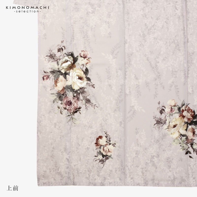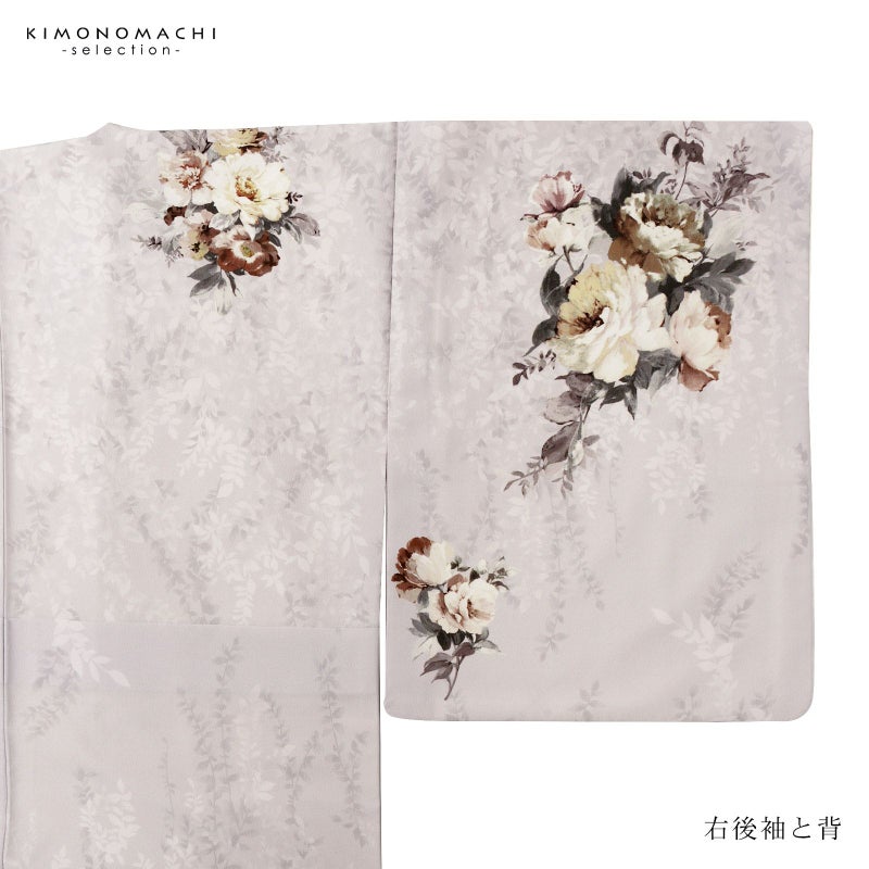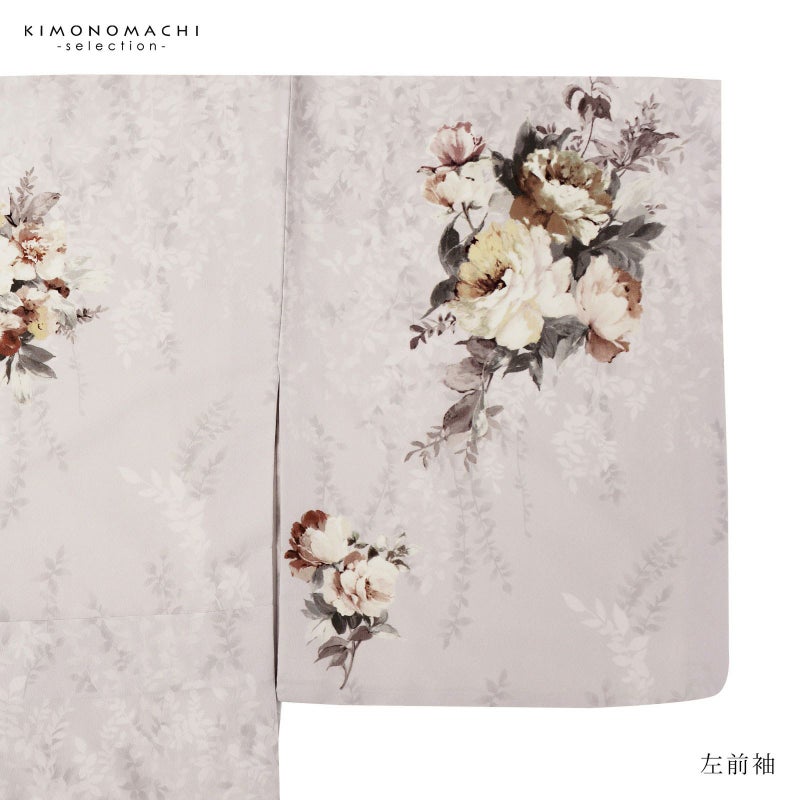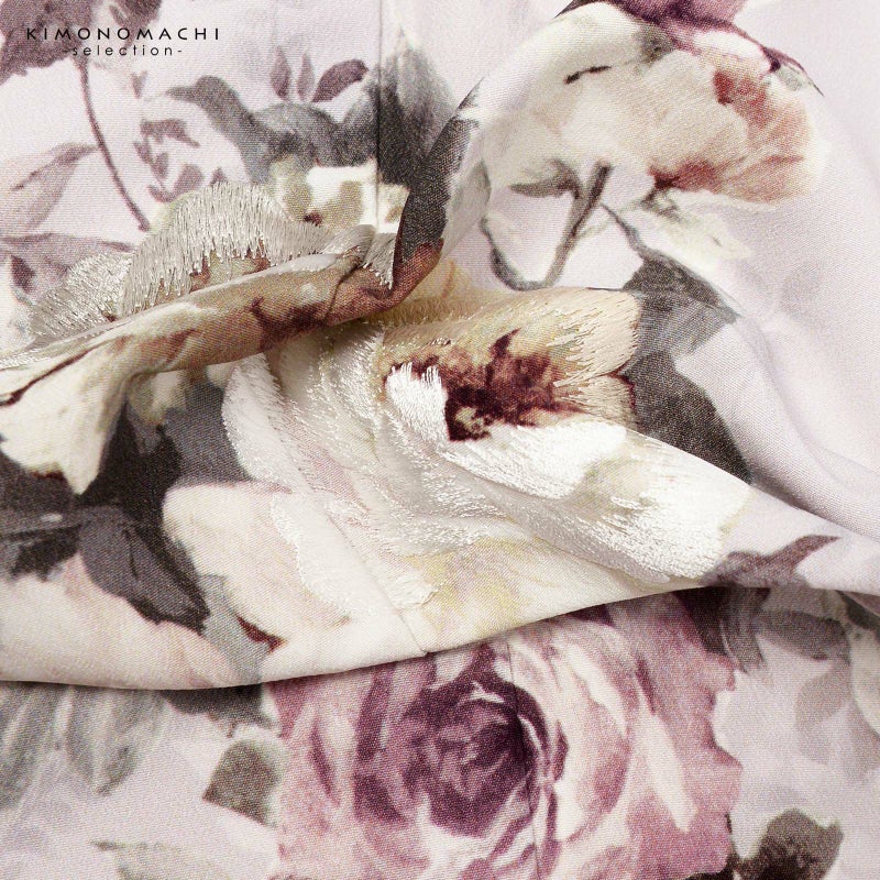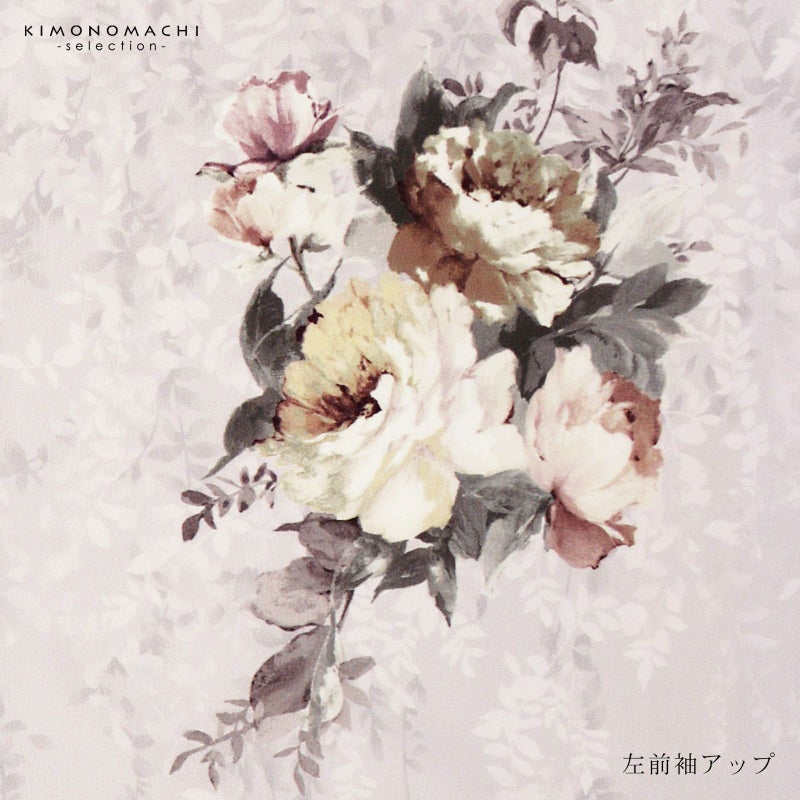 【色柄】ややグレイッシュな淡い藤色に濃淡のある葉の文様が全体に表現されています。クリーム色、浅いくすんだ赤紫、チャコールグレーの洋花のブーケ。上前のポイントに刺繍が施され、華やかさを添えます。モダンな洒落感のある訪問着です。