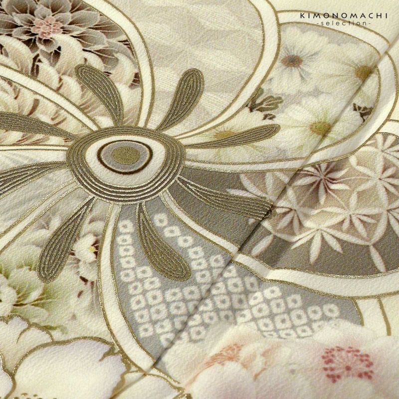 【色柄】淡いクリーム色の地に、右の身頃には淡いベージュの輪違麻の葉文様。白にグレージュ系の花や吉祥紋を詰めたねじ梅、八重桜、淡いピンクの桜。ポイントにホワイトゴールドの金彩。上品でモダンな洒落感のある訪問着です。