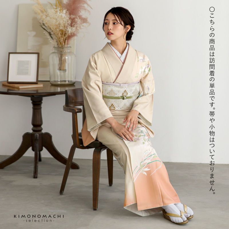 【色柄】グレイッシュな黄みのベージュの地に洗い柿色のぼかし。黄緑、青磁色、白、淡い灰紫に淡い黄色のしだれ桜や牡丹、サーモンオレンジの野菊、灰紫に黄色の露草、グレージュにグリーンの露芝に白の女郎花や尾花が抽象的に表現されています。季節感を限定しない個性と優しい上品さを感じさせる訪問着です。