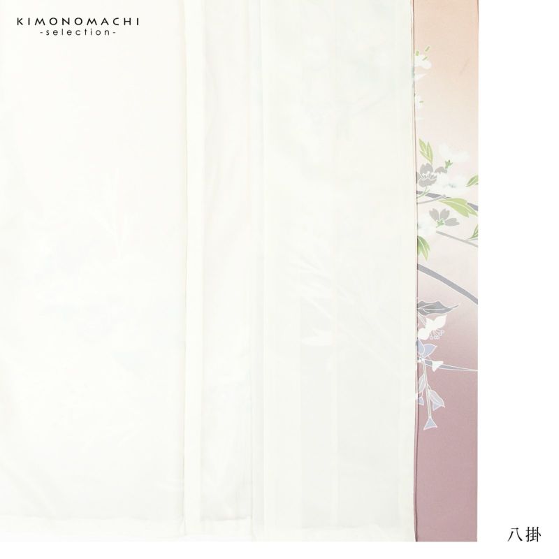 【色柄】グレイッシュな淡い赤みのピンクの地に紅藤色のぼかし。黄緑、青磁色、白、淡い赤紫のしだれ桜や牡丹、野菊、ブルーグレーの露草、グレーの露芝に白の女郎花や尾花が抽象的に表現されています。八掛はオフホワイト。季節感を限定しない個性と華やかさを感じさせる訪問着です。