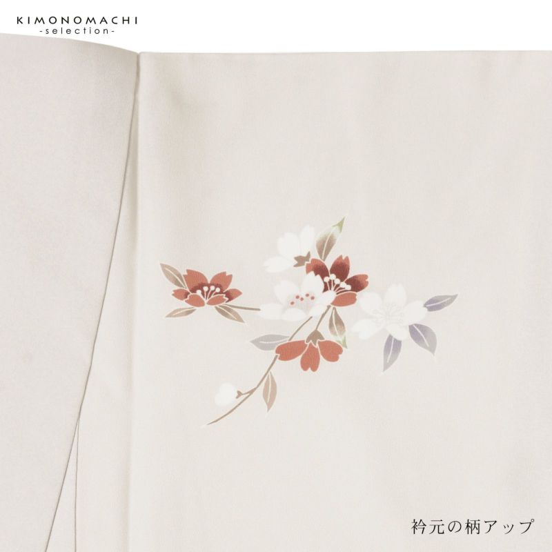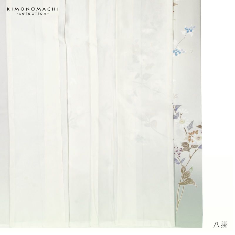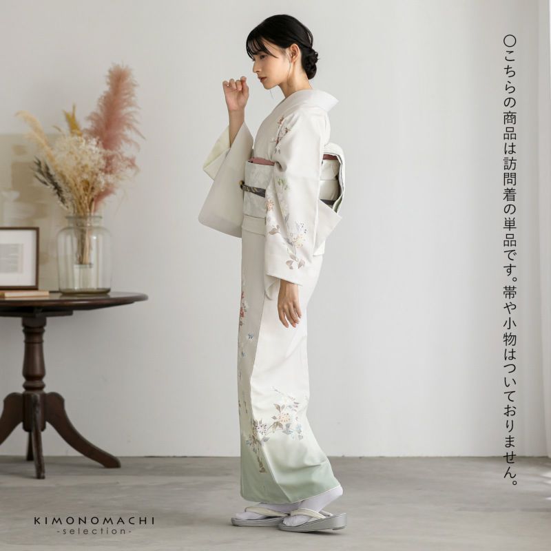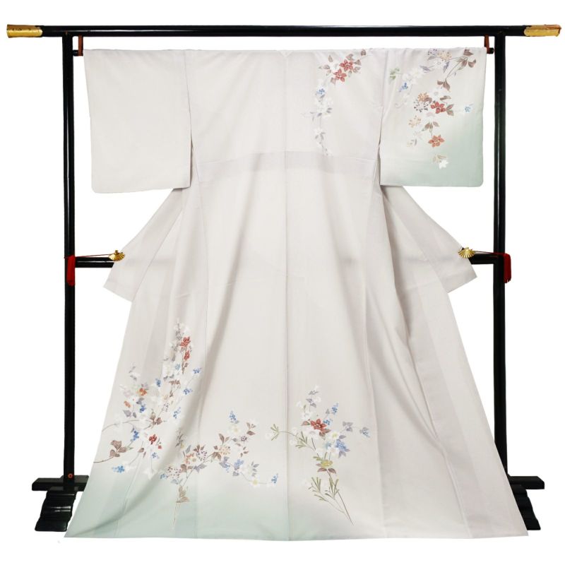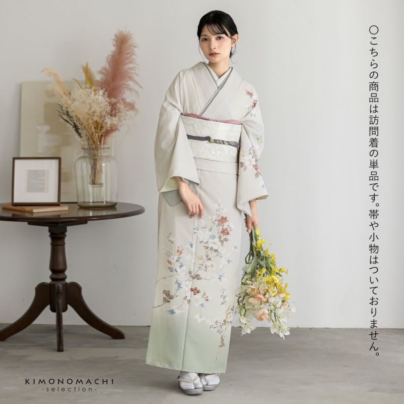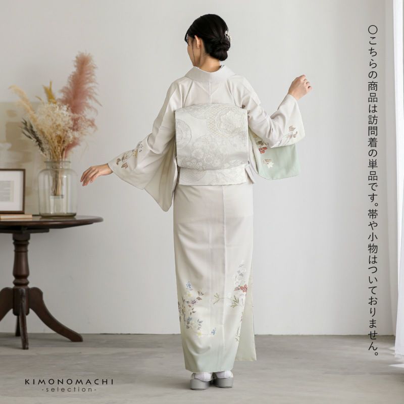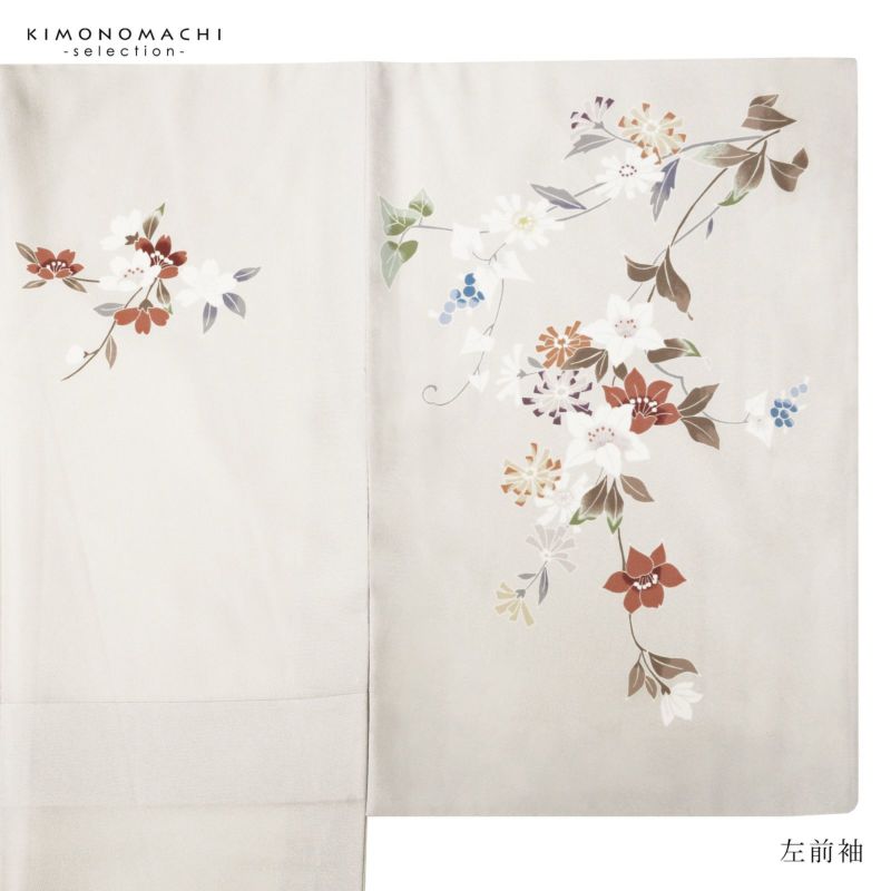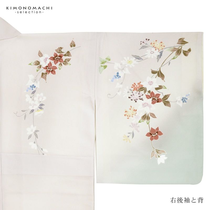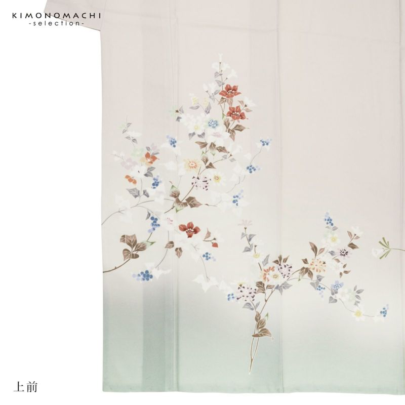 【色柄】やや黄みの淡いグレーの地に蕎麦切色のぼかし。青磁色、淡い青の野葡萄に薄紫、橙色、淡い黄色、白や錆朱の鉄線が抽象的に表現されています。八掛はオフホワイト。季節感を限定せず優しさの中に個性を感じさせる訪問着です。