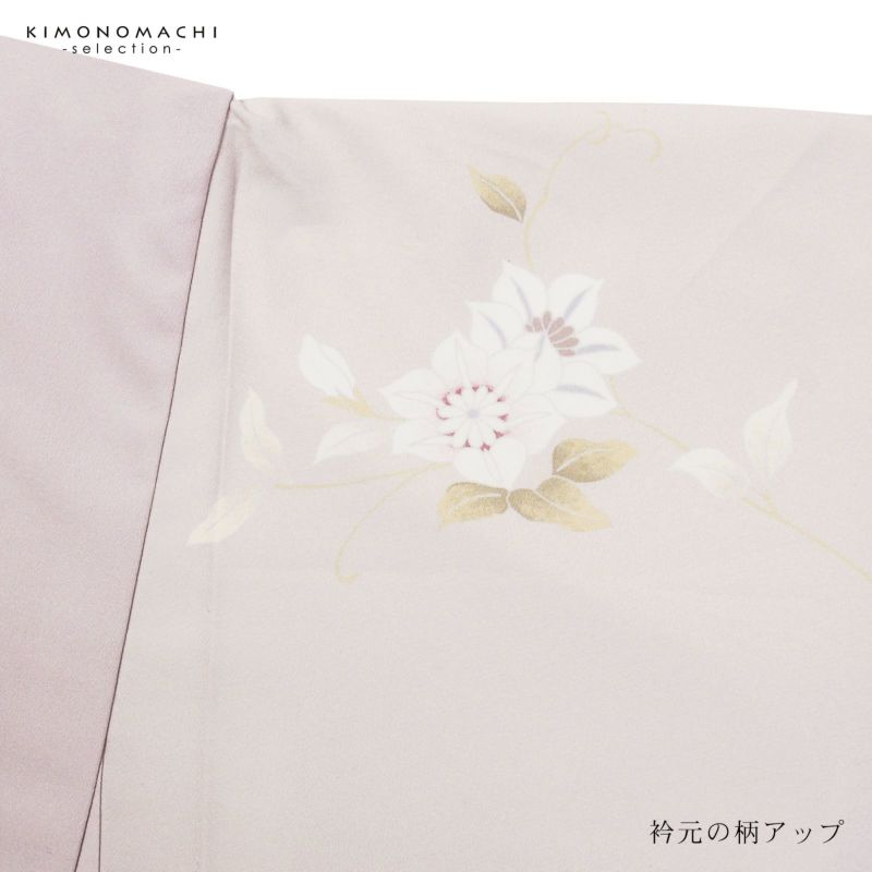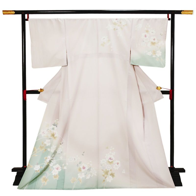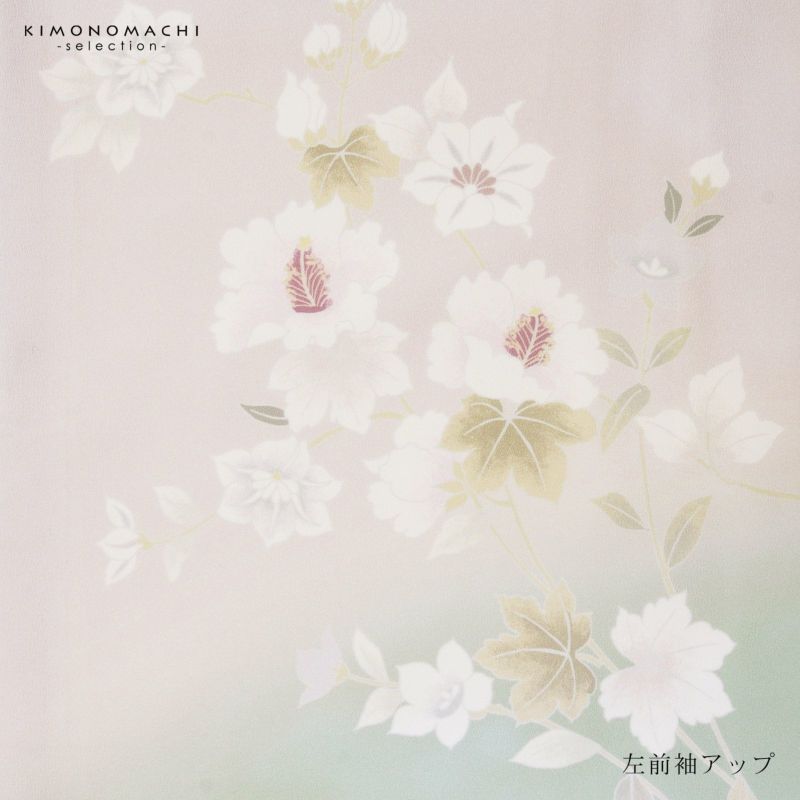 【色柄】わずかにピンクみのある淡いグレーの地に淡い青磁色のぼかし。グレーの糸目に白、淡いピンクに赤紫、薄いブルーグレーに青藤色、浅い抹茶色や黄緑で表現された芙蓉の花、蔦を伸ばす鉄線の花。八掛はオフホワイト。ペールトーンの配色がはんなりと上品な雰囲気の訪問着です。
