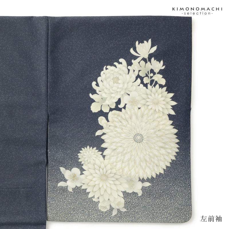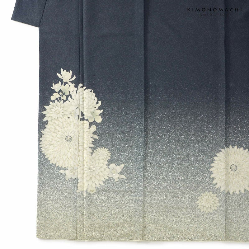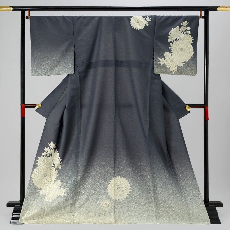 【色柄】撒き糊調の細かな地模様のある青みのグレーの地。淡いグレーの裾ぼかしに細かな金彩。オフホワイトに淡いグレーのぼかしが入ったむじな菊に厚物菊、桜のお花。輪郭に金彩。シックで気品のある訪問着です。