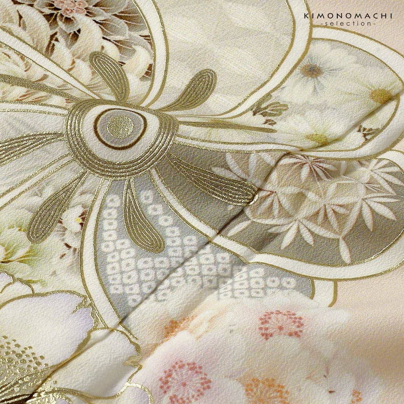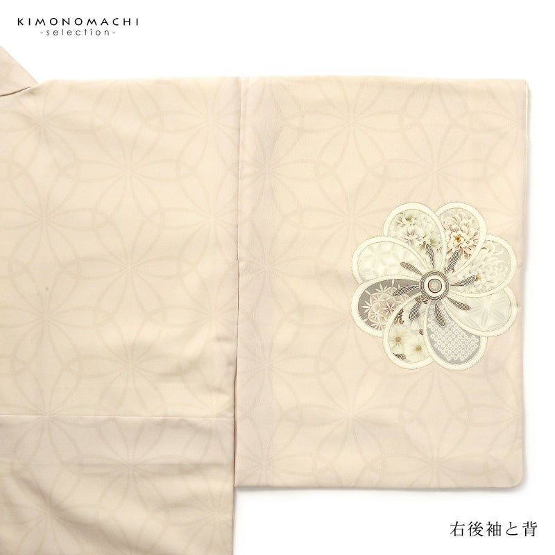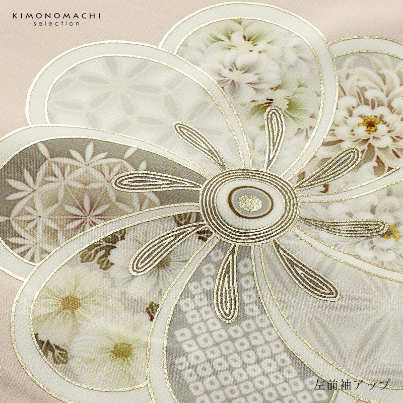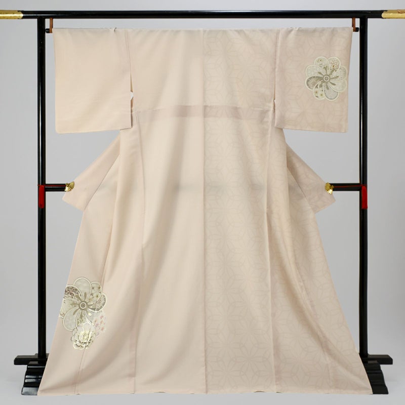 【色柄】グレイッシュなピンクベージュ色の地に、右の身頃には淡いグレーの輪違麻の葉文様。白にグレージュ系の花や吉祥紋を詰めたねじ梅、八重桜、淡いピンクの桜。ポイントにホワイトゴールドの金彩。華やかさとモダンな洒落感のある訪問着です。