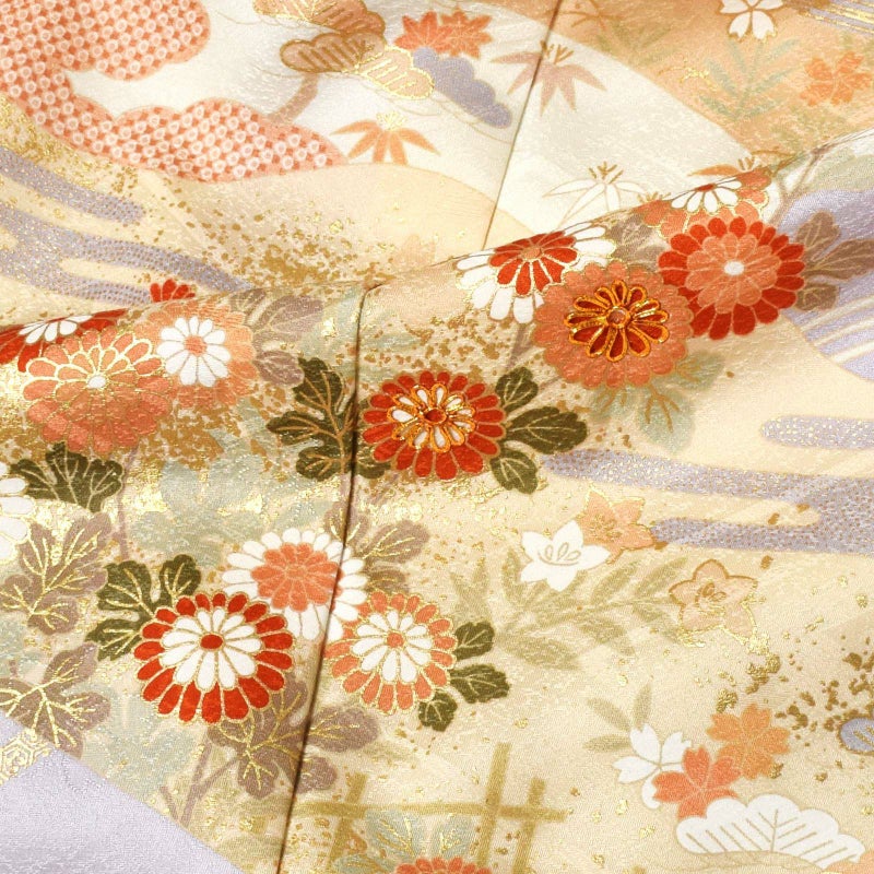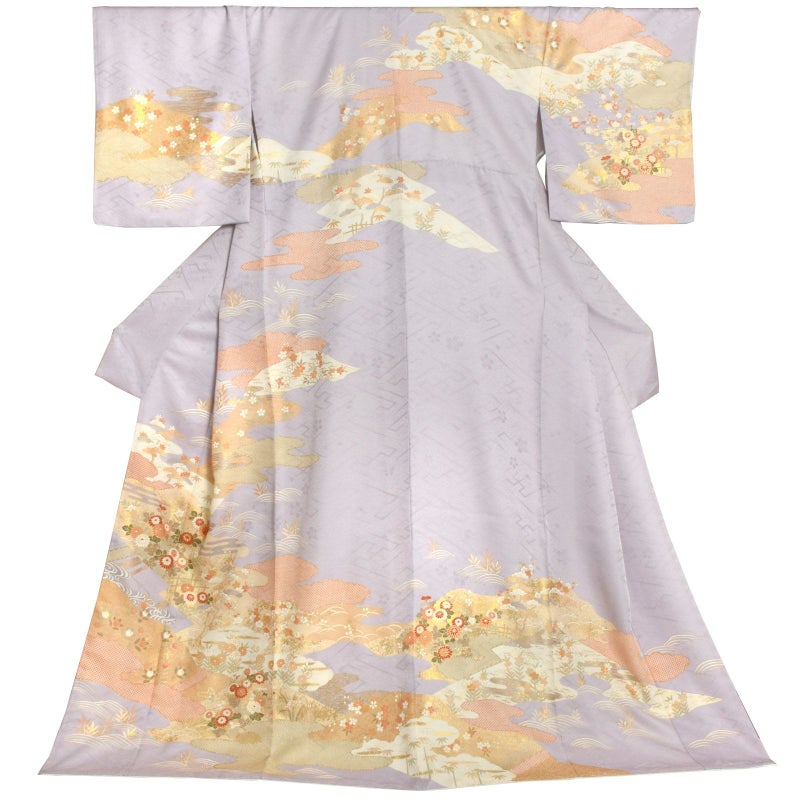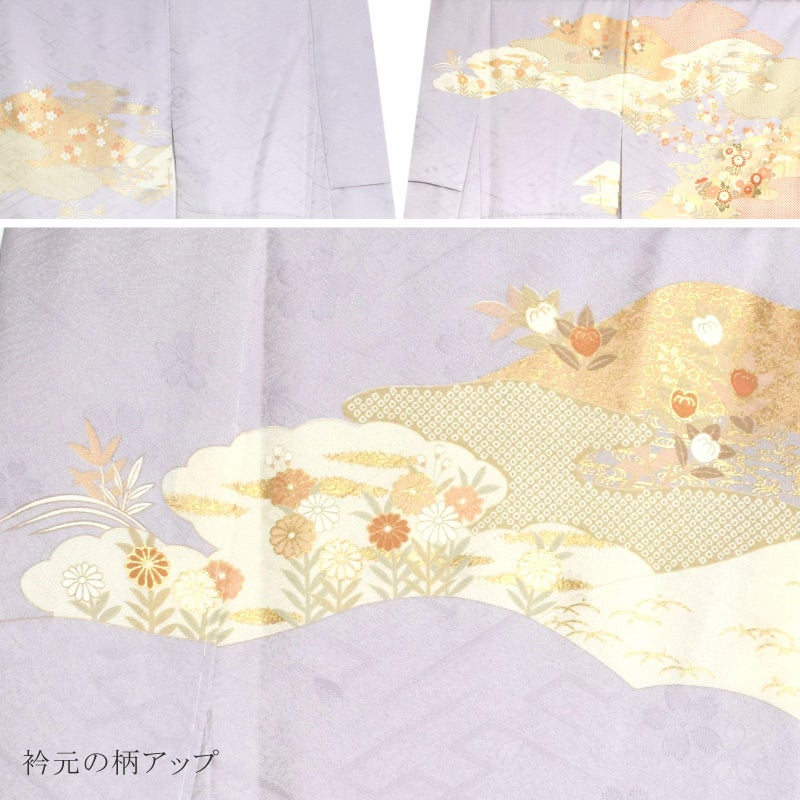 【色柄】紗綾形に桜の地模様、淡い藤色の地。淡い珊瑚色、生成色の霞に波、流水。橙色、白、抹茶色、淡い香色などの籬に菊の花、橘や梅、葦に桜など。ポイントに金彩や金駒刺繍。落ち着いた美しさと雅趣を感じさせる訪問着です。