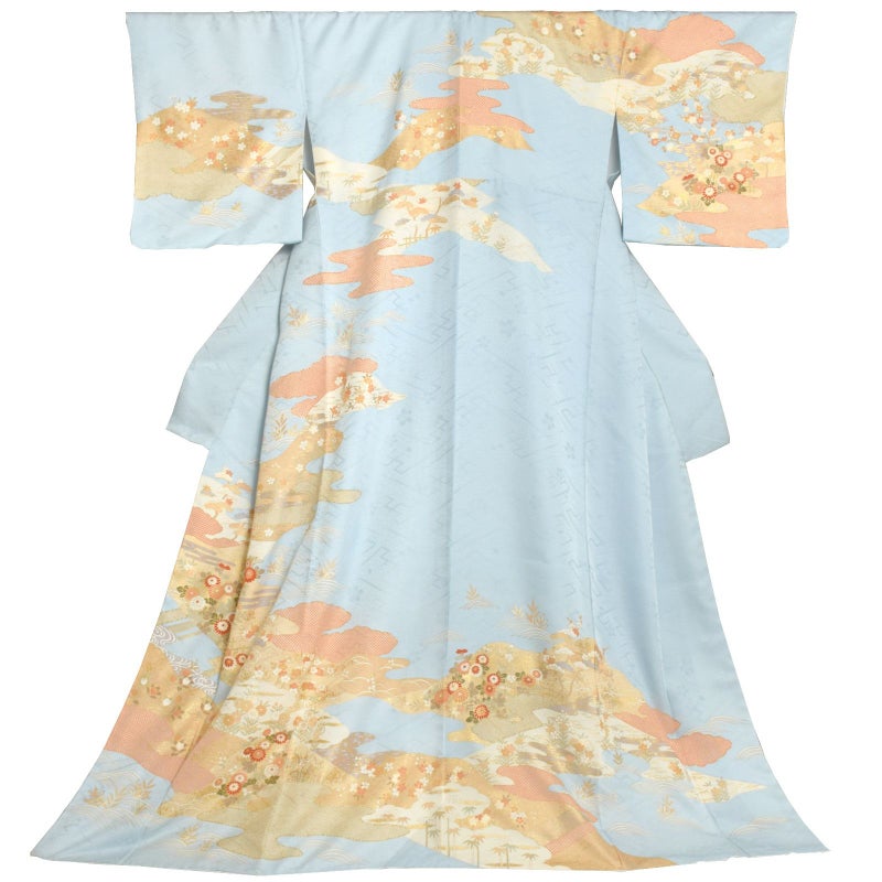 【色柄】紗綾形に桜の地模様、水色の地。淡い珊瑚色、生成色の霞に波、流水。橙色、白、抹茶色、淡い香色などの籬に菊の花、橘や梅、葦に桜など。ポイントに金彩や金駒刺繍。清らかな美しさと雅趣を感じさせる訪問着です。