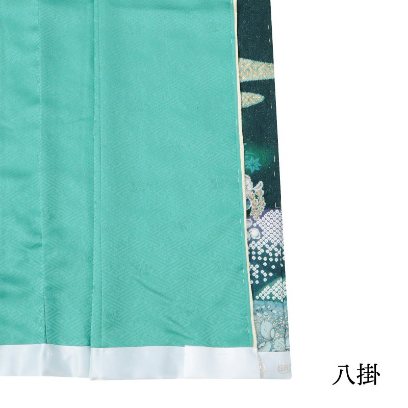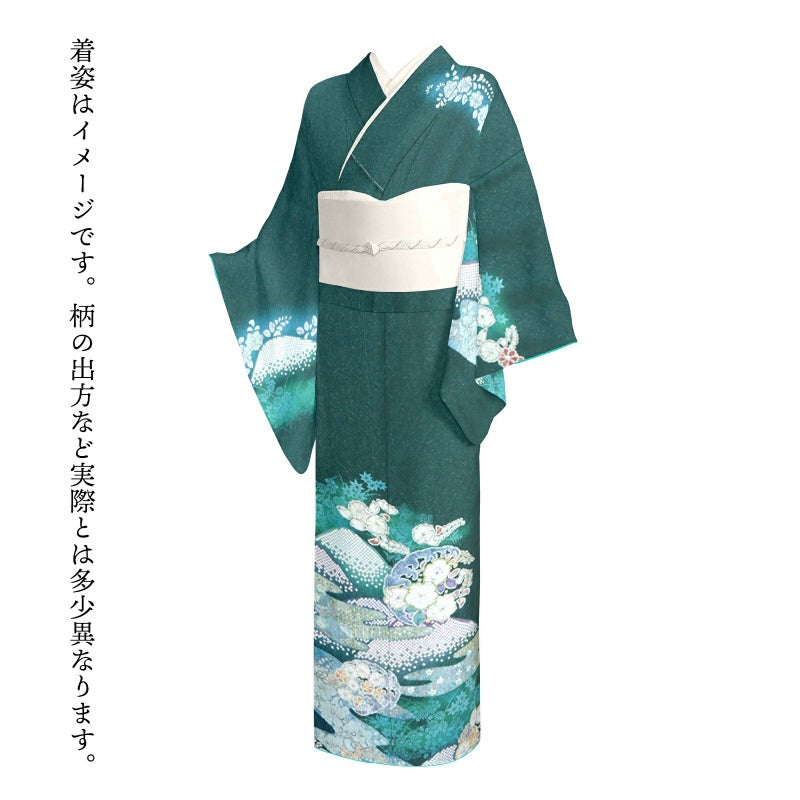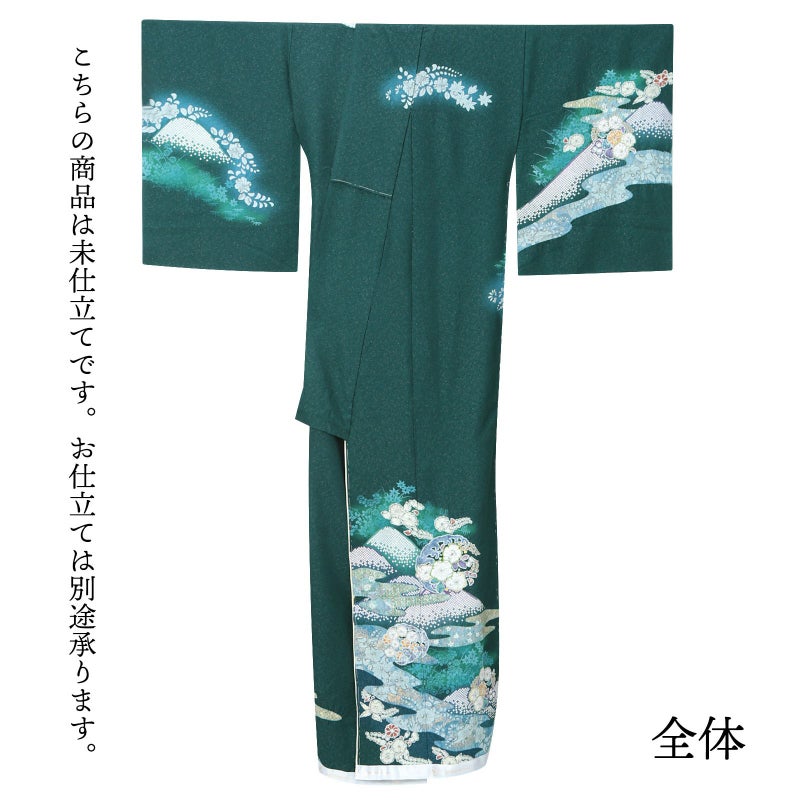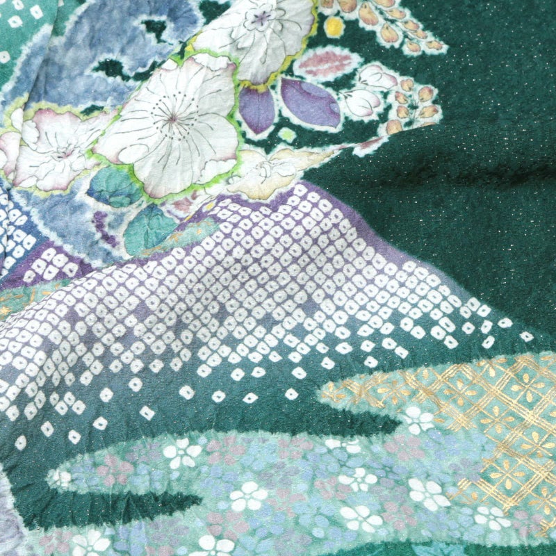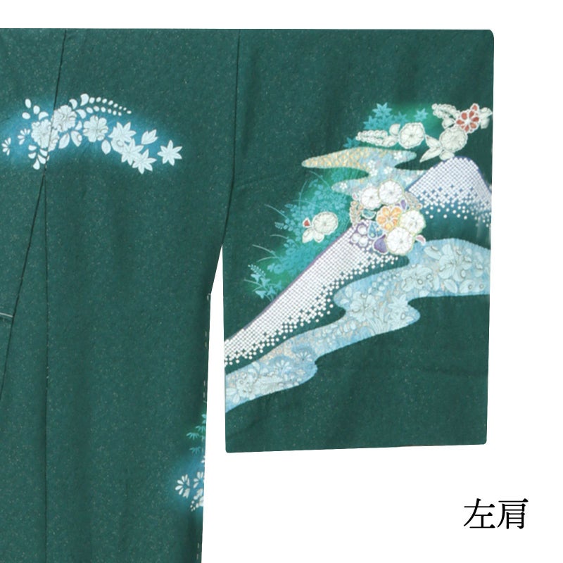 深い青緑色の地。細かな地模様の立体感と、金通しの煌めきが引き立ちます。薄い青系のシルエットで楓や菊などの秋草に、辻が花模様の波の丸、遠山に霞。黄緑や橙色、薄桃色、淡い藤色などの彩りと、絞りの柔らかな風合いが優美な訪問着です。