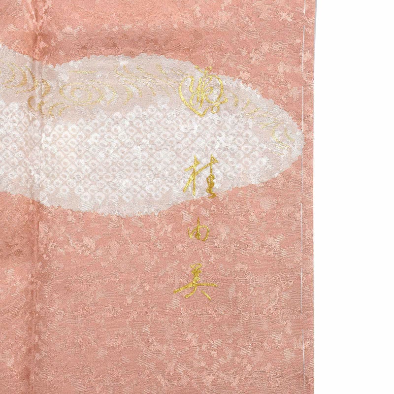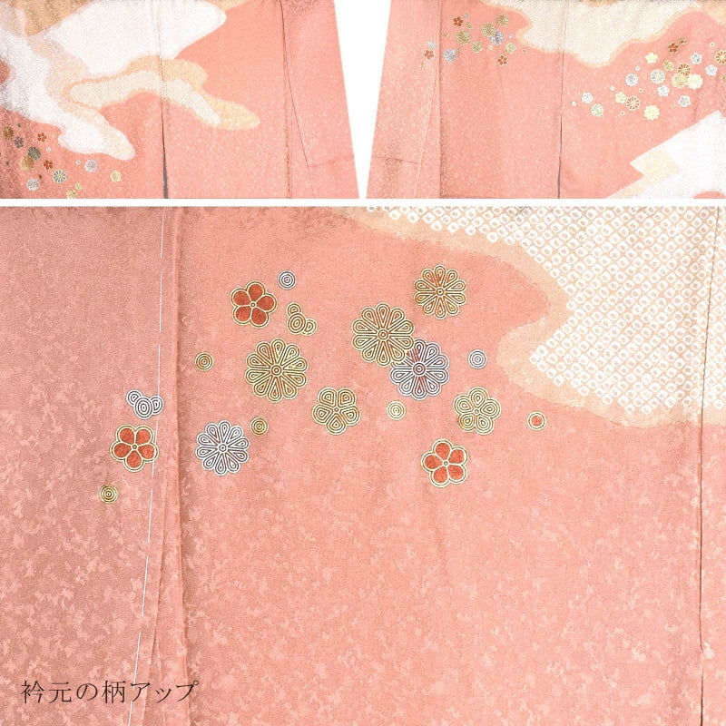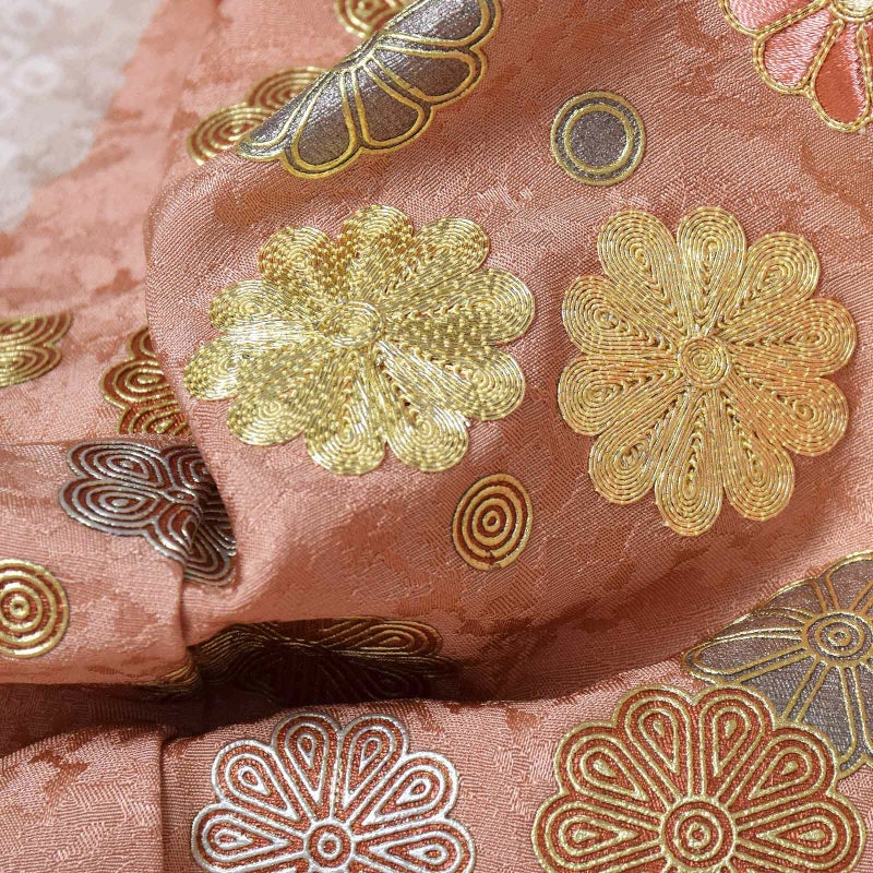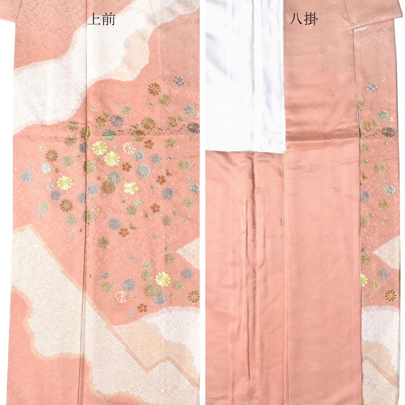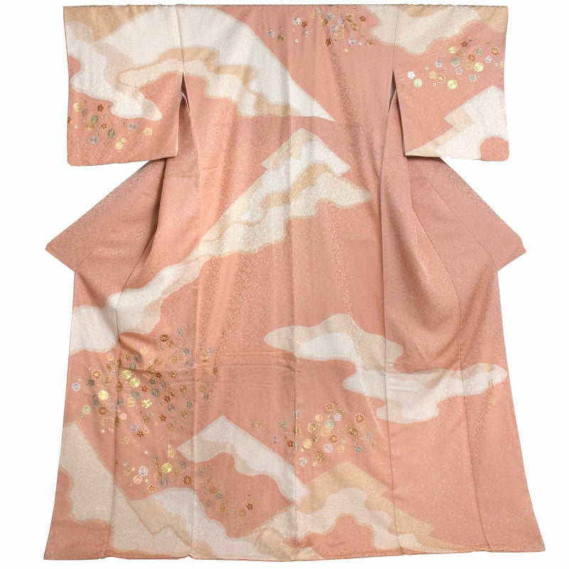 細かな地模様のある生地。やや灰みのやわらかいコーラルオレンジの地に、生成色や香色の山と霞取り。その中に疋田や金の流水や吹き寄せなどの小紋。上前や袖を中心に、立体的な金彩、銀彩、金駒繍の菊紋や梅文が散らされています。