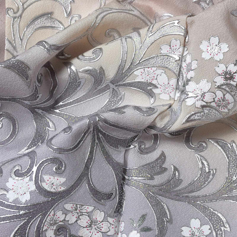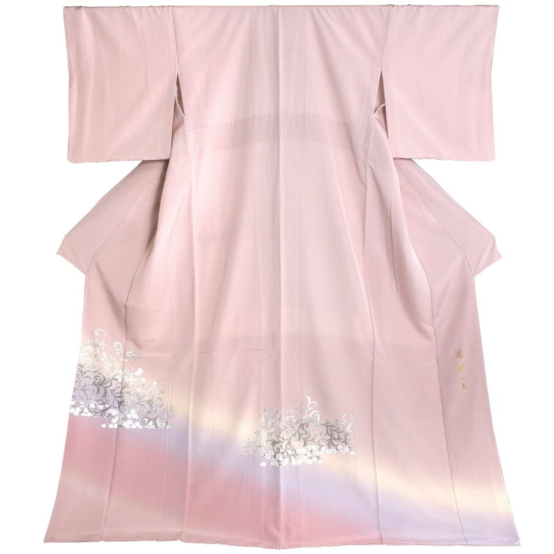 灰桜色に淡いベージュや藤色、薄桃色のやわらかいぼかしの地。銀彩に白、緑の桜花にラメ感のある銀彩の唐草文様が飛び柄で配置されています。上品さと個性を合わせ持った訪問着です。