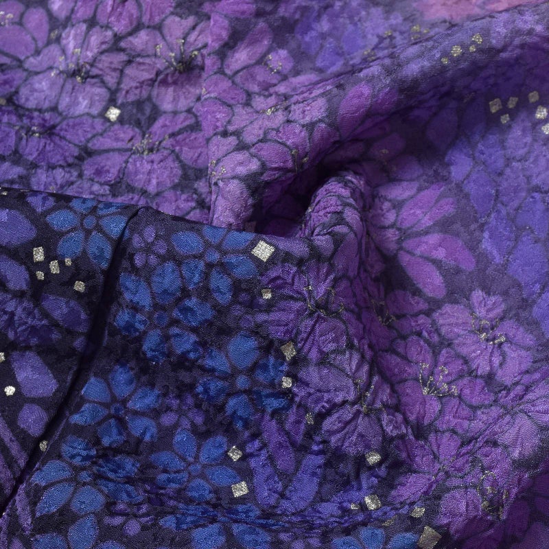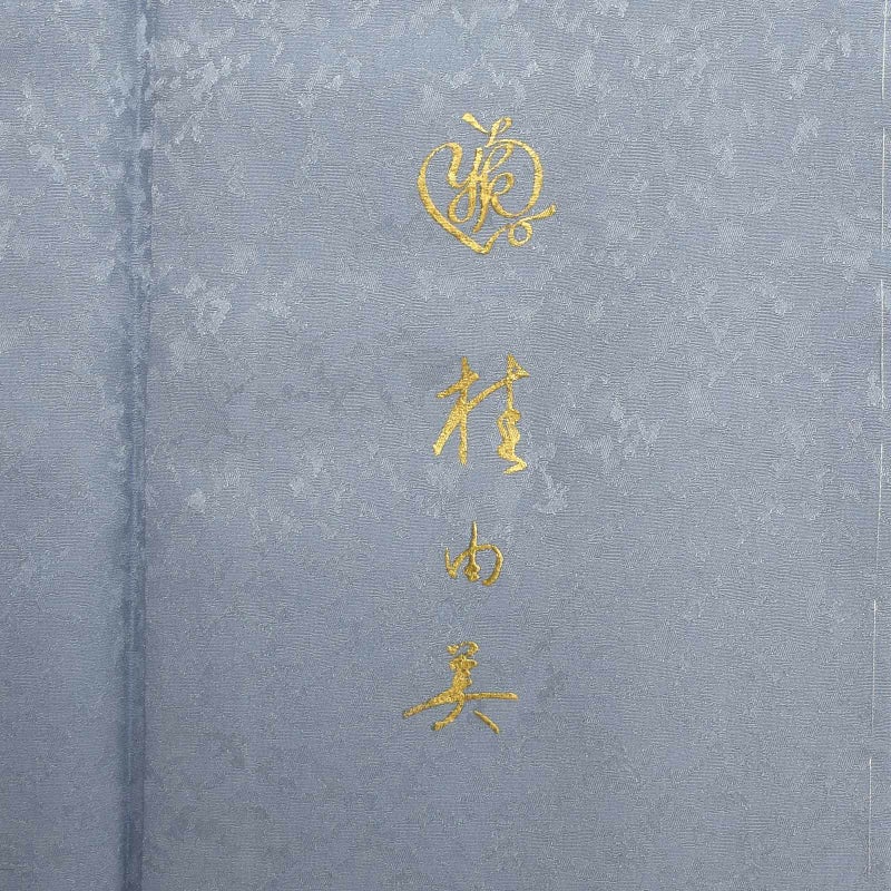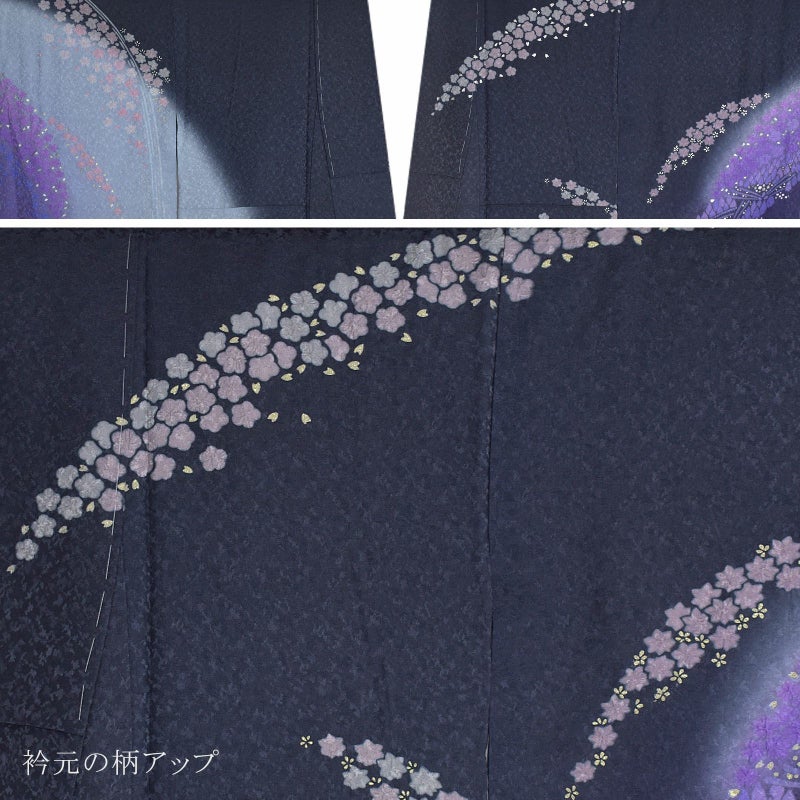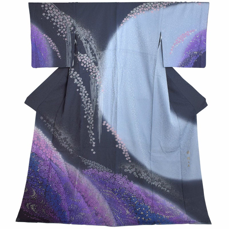 細かな地模様のある生地。墨色の地に右袖から背にかけて弧を描くように青みのグレーで染め分けられた地。グレーの滝に沿ってグレーや牡丹鼠色の桜。裾には流れるような配置で紫、ピンク、青藤色、浅い赤紫色の桜の花々が密に表現されており、まるで花筏のよう。ポイントの金彩が控えめな煌びやかさを添えています。
