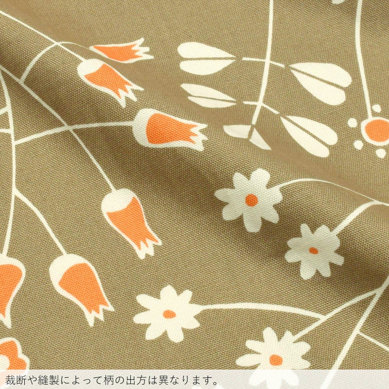 【カラー】ややグレイッシュな明るい黄茶色の地。生成り色の線で表現された、イラスト風の草花の柄。ホオズキのような、浅いオレンジ色のベル型のお花がポイントです。