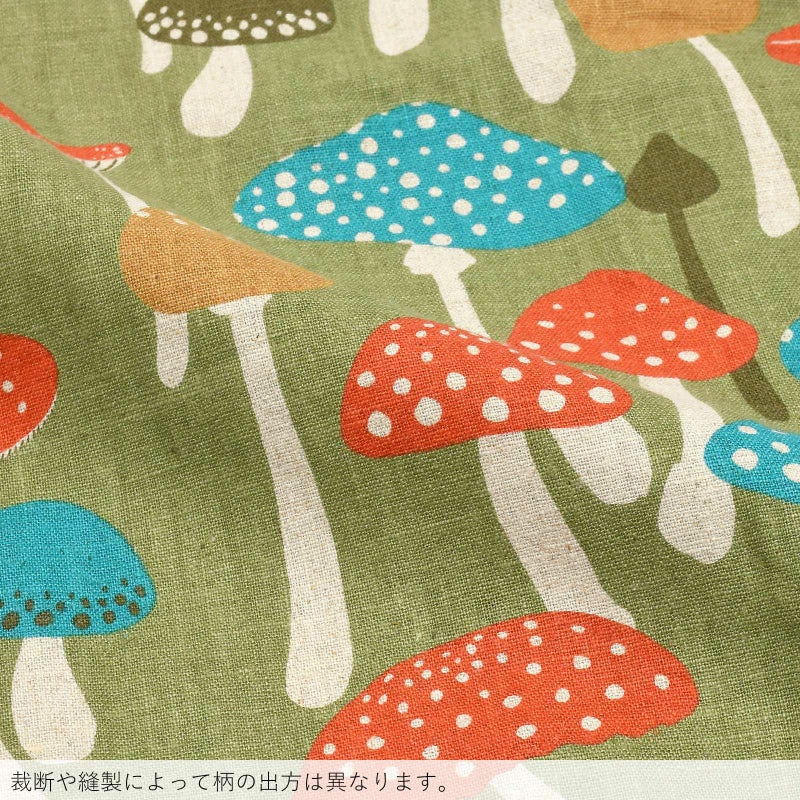 【カラー】少しくすんだ浅いめのグリーン地にブルー、オレンジレッド、ベージュなどの色使いのキノコ模様。