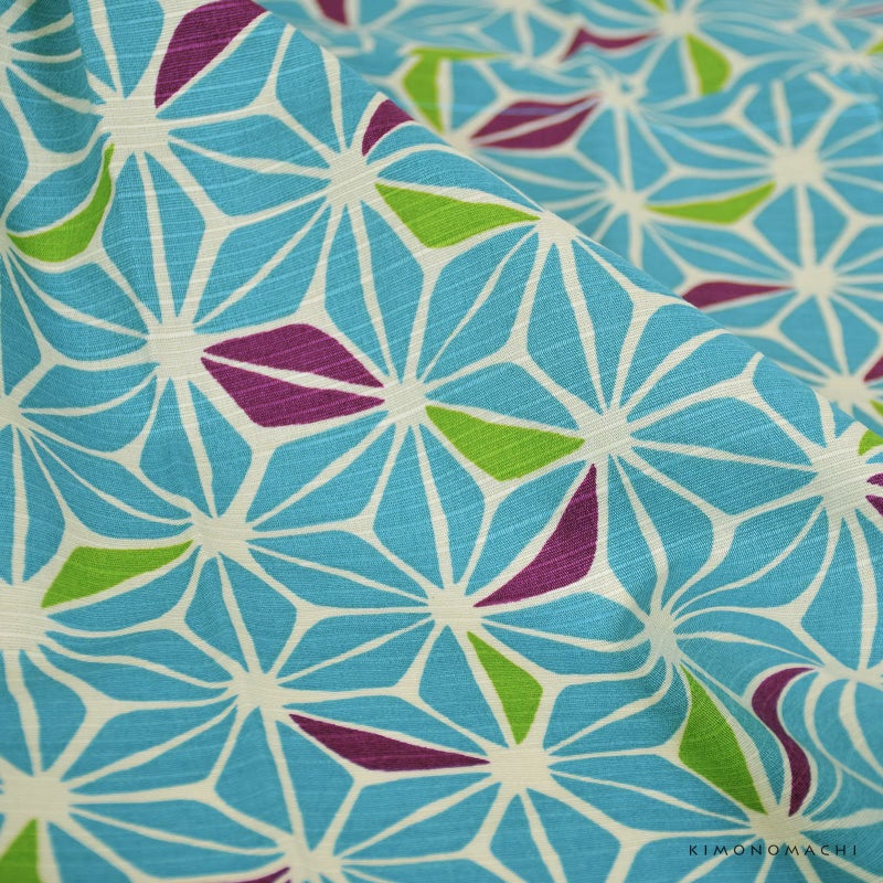 浅い青色の麻の葉柄。紫、濃い黄緑の色合いがアクセントに。レトロモダンな雰囲気。