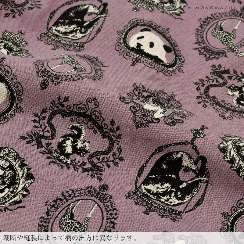 【カラー】グレイッシュな紫色の地に、浅い生成色と黒で動物の紋章が表現されています。パンダやリス、ウサギ、ゾウにライオン、キリンなど。