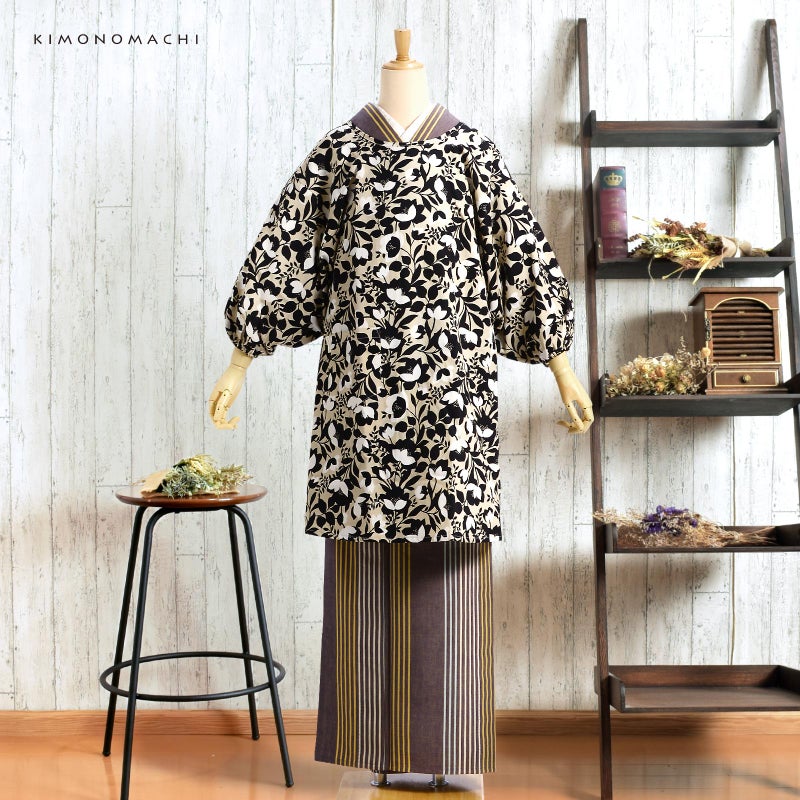 【色柄】ミルクティーのようなやわらかいベージュの地に、黒と白の抽象的なお花模様。踊るように蔓草を伸ばしています。