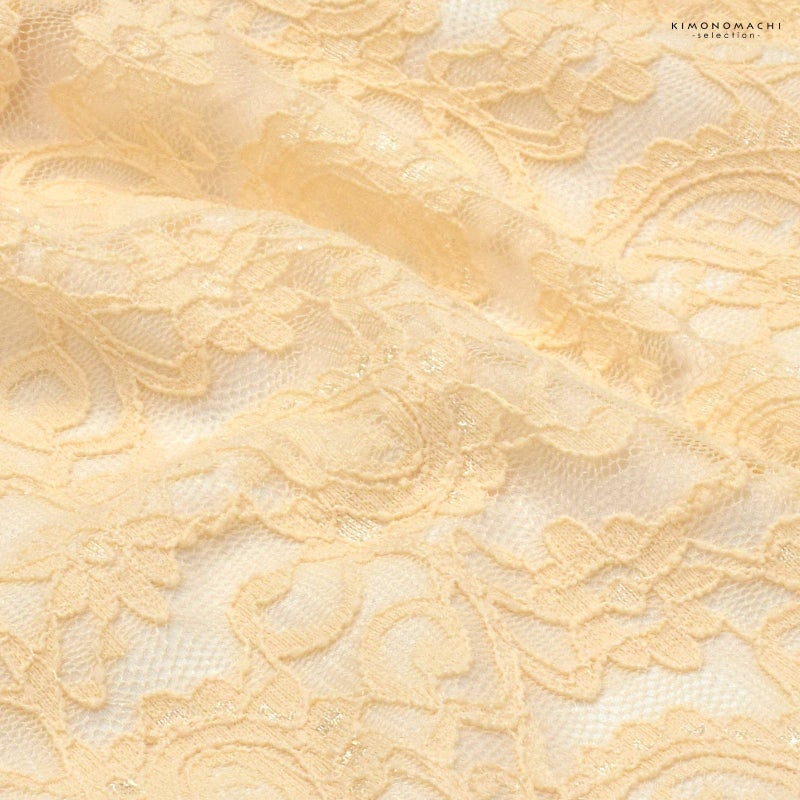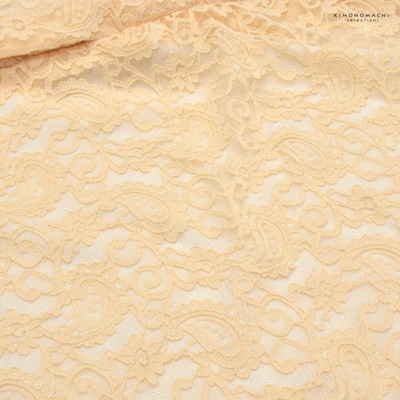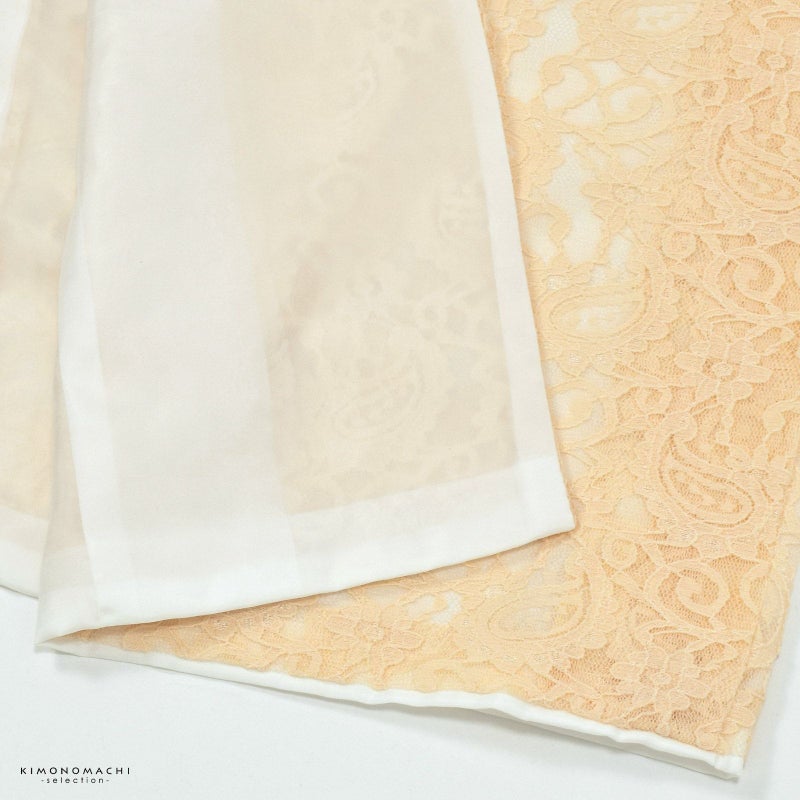 【色柄】明るい灰みの淡い橙色のレースで表現されたペイズリーや小花模様。裏地は白。