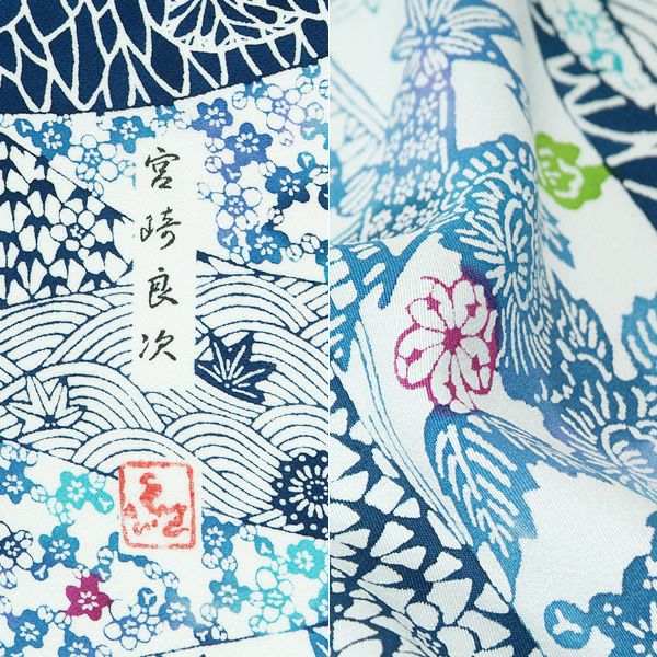 3. 【Prices down2】手ざし紅型正絹小紋着尺「白色×紺色 山岳取りに草花」未仕立て 京紅型 反物 洒落着 宮崎良次 【メール便不可】<T>ss2512kck45