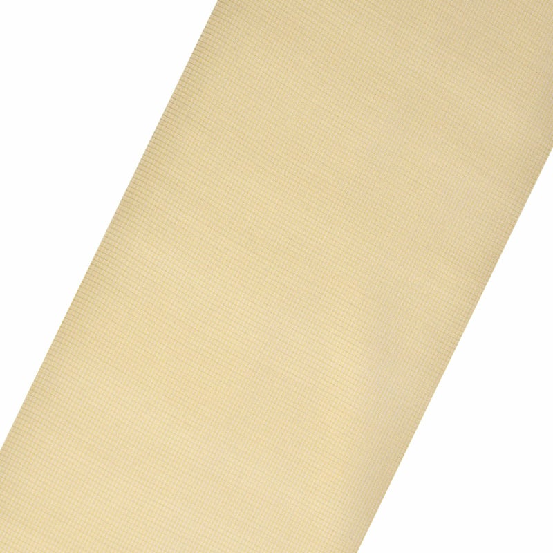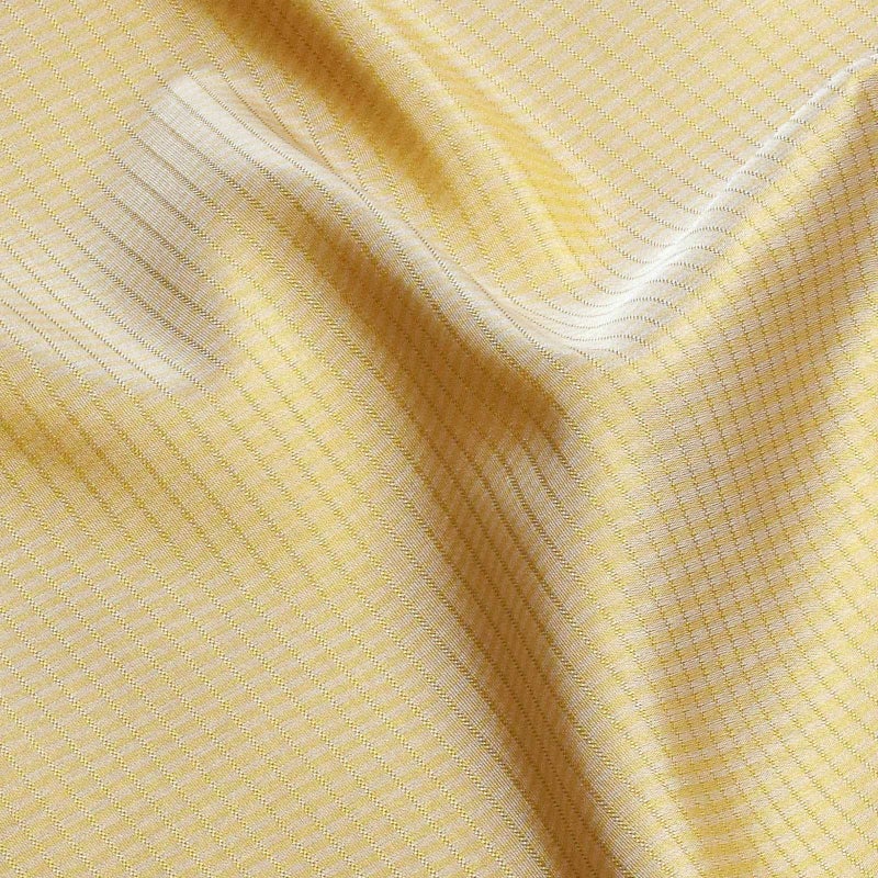 淡い生成り色とグレイッシュなキャメルの細い縦縞に、織で表現された細かな横縞が交わった格子模様。遠目には淡いカーキのように見えます。