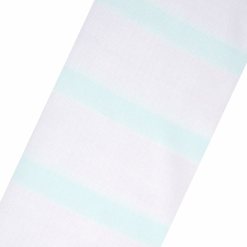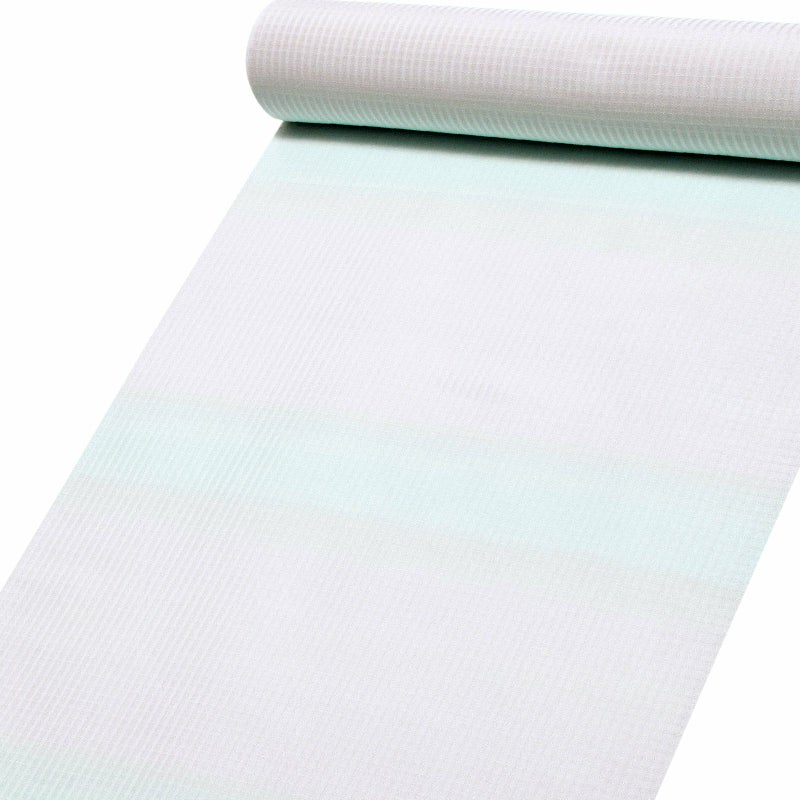 透け感のある夏の御召しです。織で表現された細かな格子の地に、ごく淡い黄みの桃色に淡い浅葱色の横段。