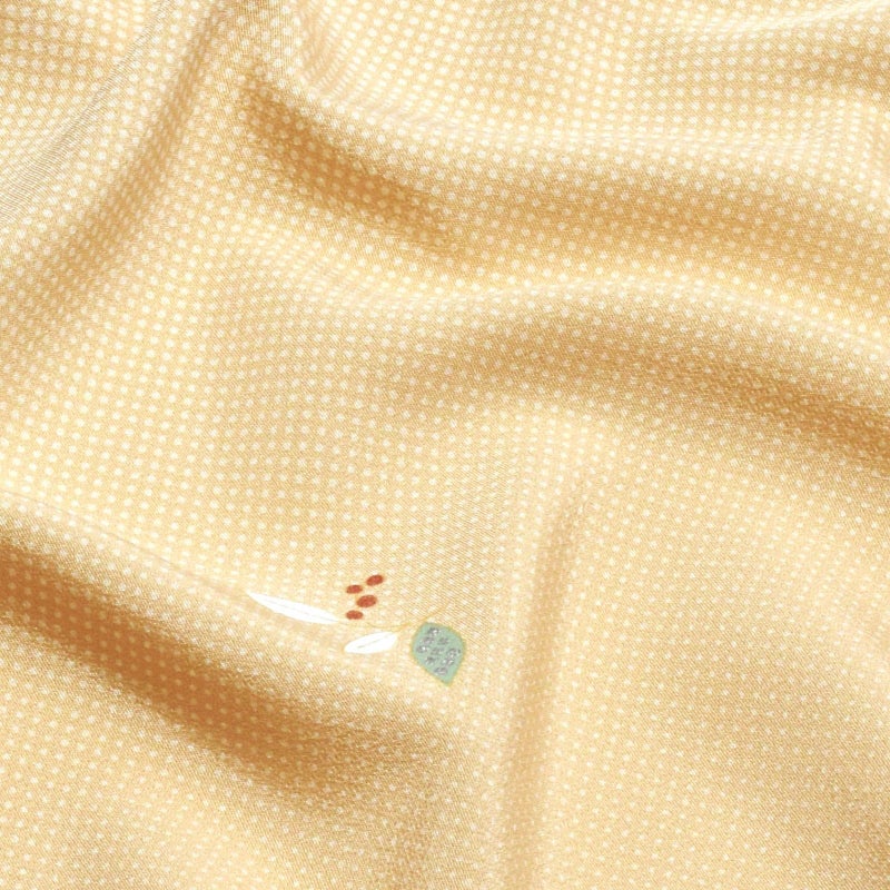 淡くやわらかい浅い橙色の地に、オフホワイトの点々が並んだ行儀の模様。金彩に銀、白と青磁色の葉、錆朱色の実の南天の小枝が飛び飛びに表現されています。
