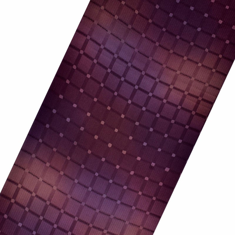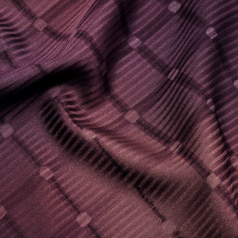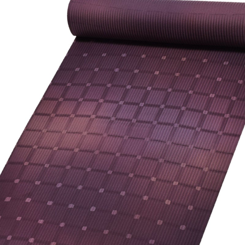 縦縞の地模様の生地に、格子を表現した地。格子の交点が淡い白のドットになっています。深い赤紫、紫鳶色、浅紫色など紫系の色がぼかしに染められています。