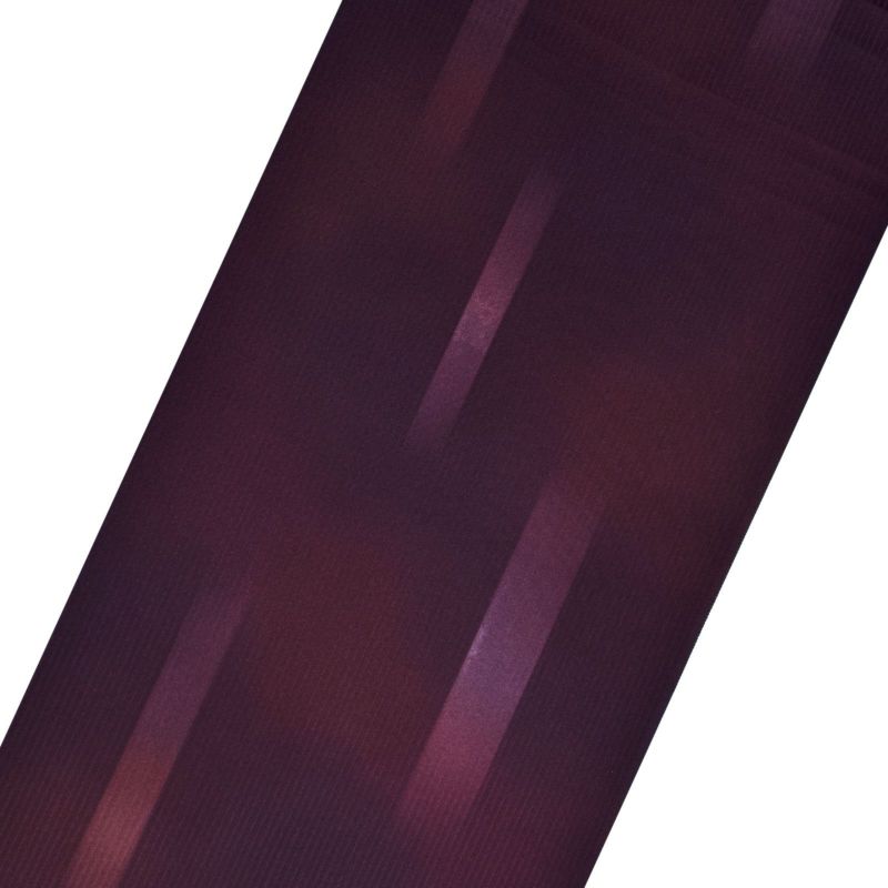 縦縞の地模様の生地に、深い赤紫色、紫鳶色がぼかしに染められた地。灰みの浅い短冊模様が、間隔をあけて表現されています。