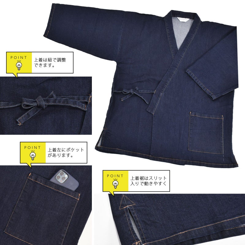 ストレッチ素材で着心地柔らかなデニム作務衣です。