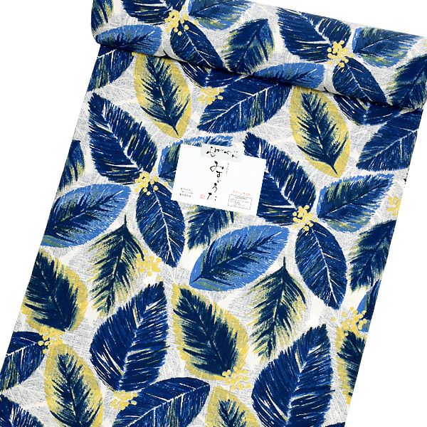 【カラー】薄い生成り地にブルー、イエローのリーフ模様。少し落ち着いた色めの綺麗な雰囲気。