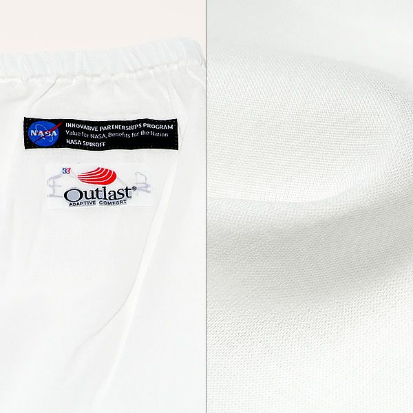 Outlast(アウトラスト)とは、NASAのために開発された素材です。快適な肌の表面温度をコントロールして、着心地のよさを保ちます。暑いときでも、寒いときでも、ずっと快適にコントロールする最先端の温度調整素材です。炎天下の中でも、寒さの厳しい場所でも、人間がいちばん快適だと感じる温度(31℃~33℃)をキープしようと働きかけます。