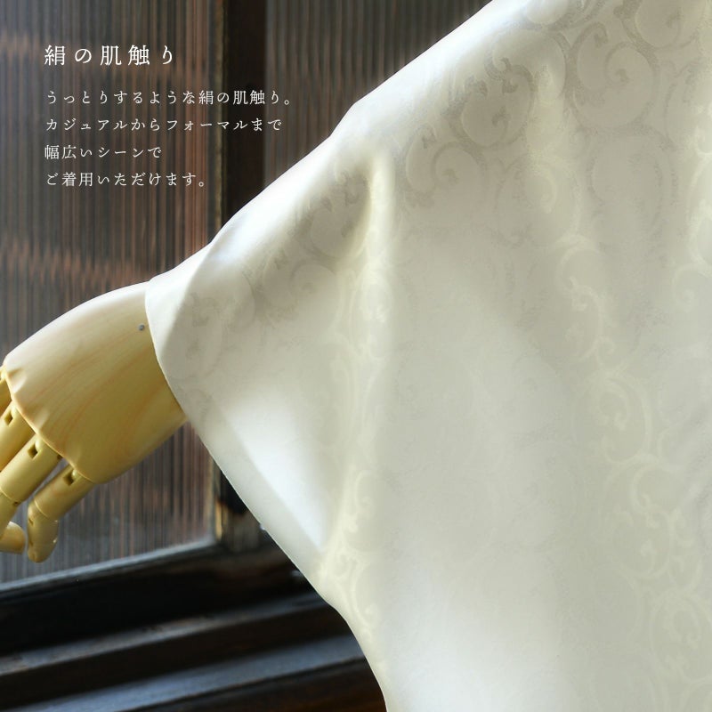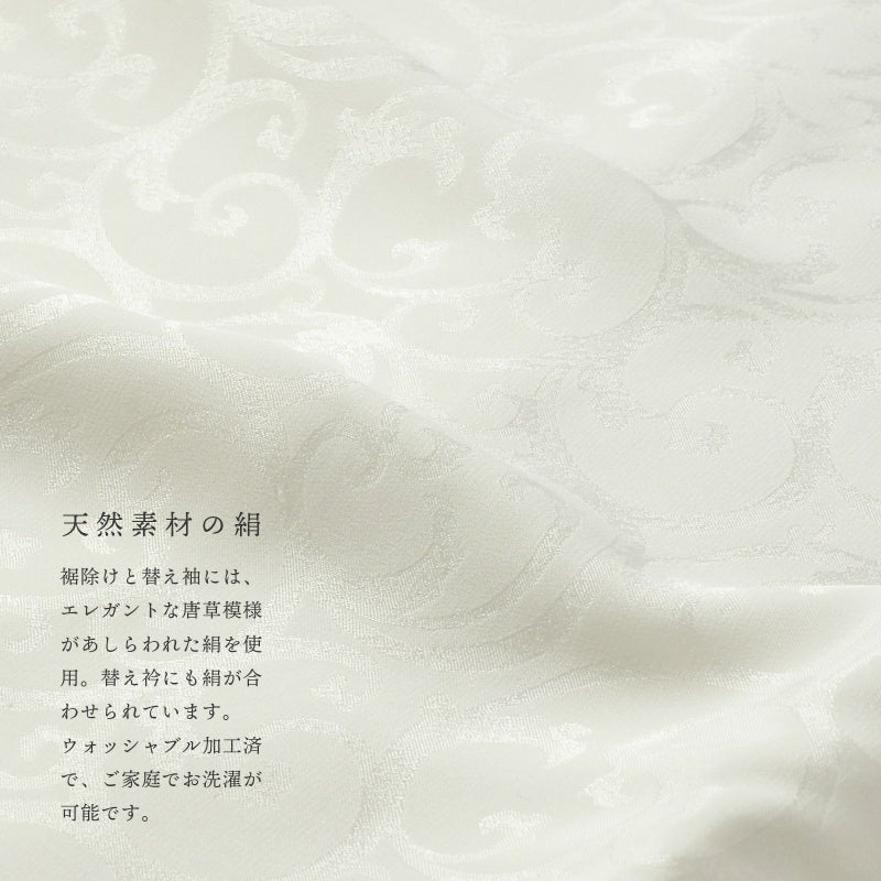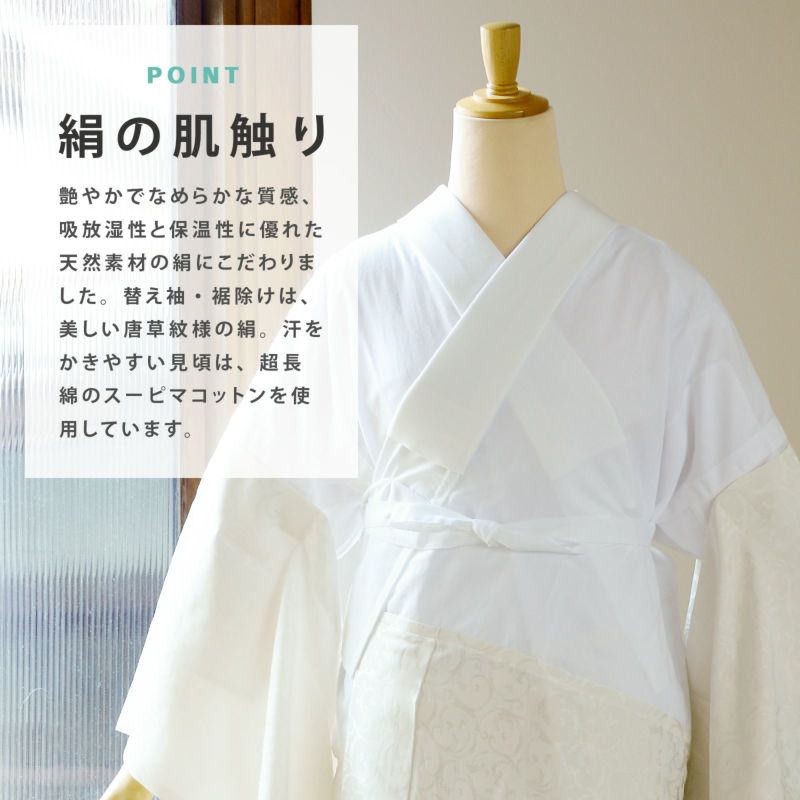 艶やかでなめらかな質感、吸放湿性と保温性に優れた天然素材の絹にこだわりました。替え袖・裾除けは、美しい唐草紋様の絹。汗をかきやすい見頃は、超長綿のスーピマコットンを使用しています。