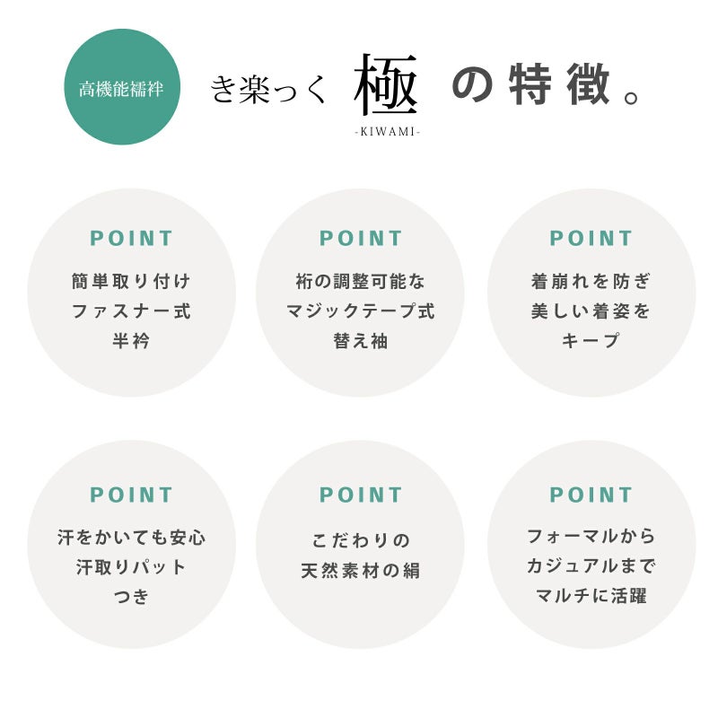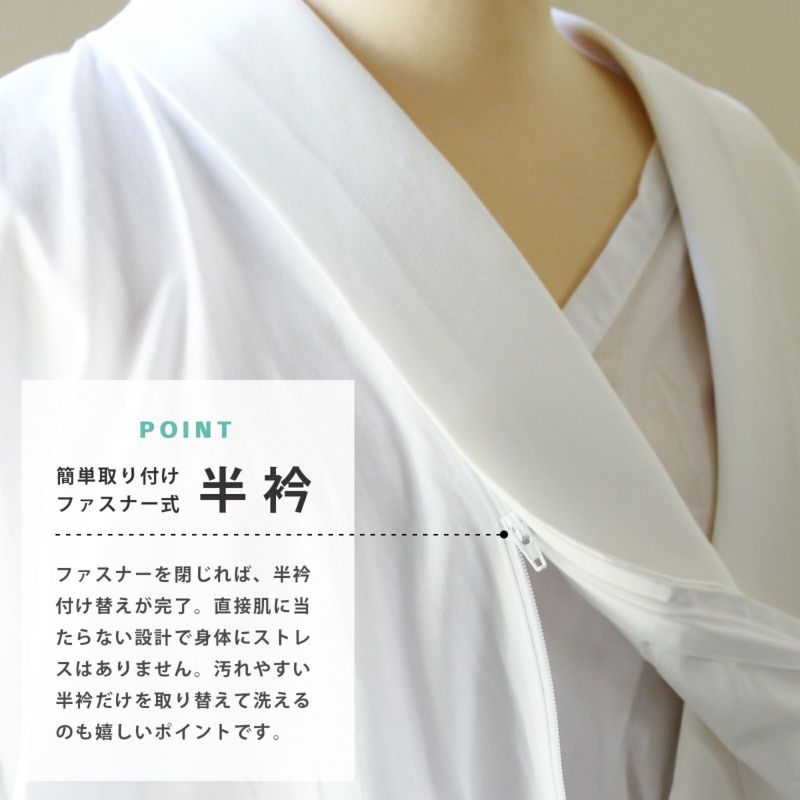 ファスナーを閉じれば、半衿付け替えが完了。直接肌に当たらない設計で身体にストレスはありません。汚れやすい半衿だけを取り替えて洗えるのも嬉しいポイントです。