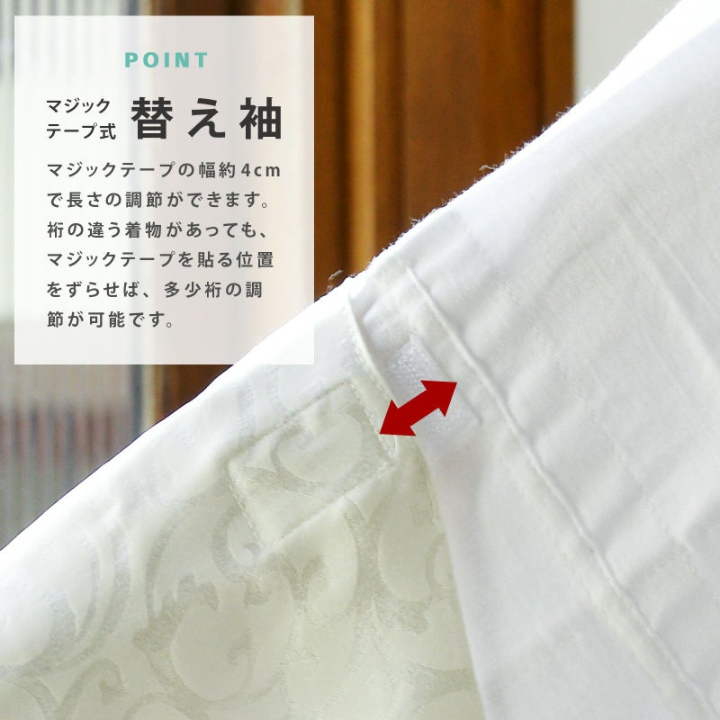 マジックテープの幅約4cmで長さの調節ができます。桁の違う着物があっても、マジックテープを貼る位置をずらせば、多少桁の調節が可能です。
