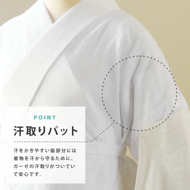 汗をかきやすい脇部分には着物を汗から守るために、ガーゼの汗取りがついていて安心です。