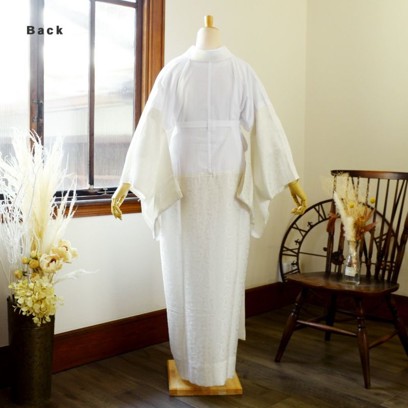 【色柄】襦袢の身頃は白地。袖と腰から下の裾よけ部分は唐草文様の地模様、色はオフホワイト。