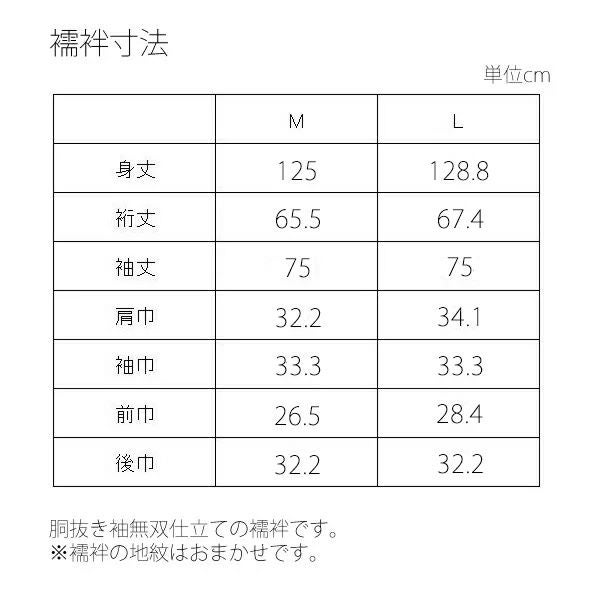 Lサイズ:身丈約128.8cm/裄丈約67.4cm/袖丈約75cm