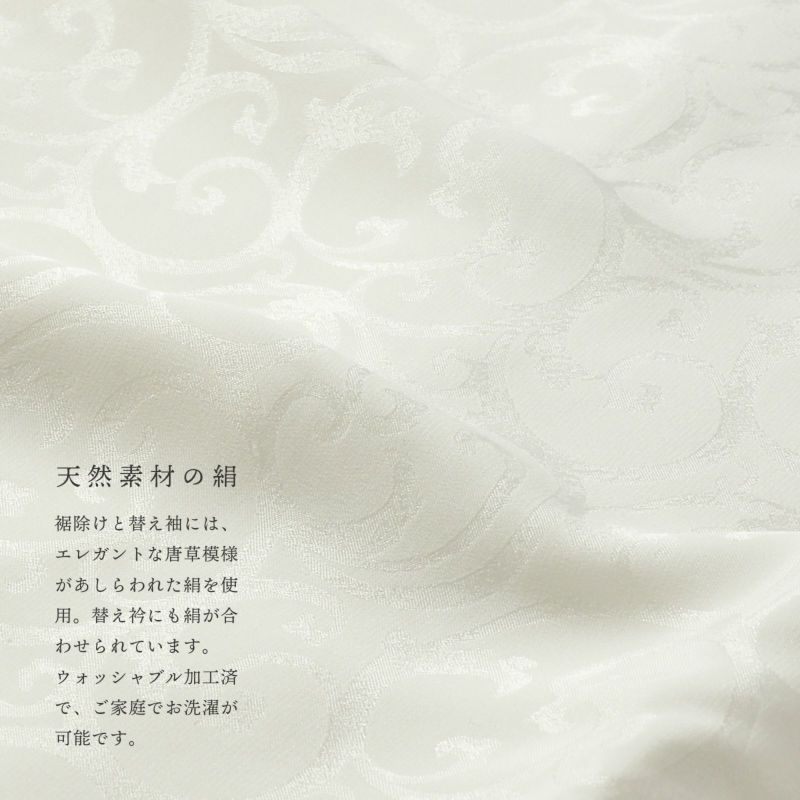 艶やかでなめらかな質感、吸放湿性と保温性に優れた天然素材の絹にこだわりました。替え袖・裾除けは、美しい唐草紋様の絹。汗をかきやすい見頃は、超長綿のスーピマコットンを使用しています。