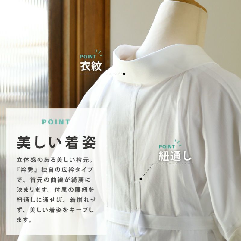 立体感のある美しい衿元。『衿秀』独自の広衿タイプで、首元の曲線が綺麗に決まります。付属の腰紐を紐通しに通せば、着崩れせず、美しい着姿をキープします。